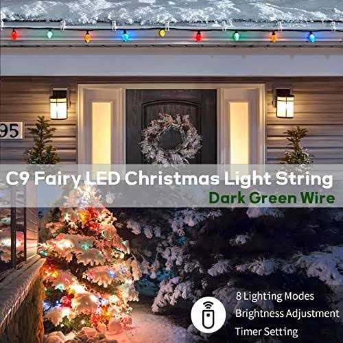String Lights by ZAIYW. Details:100LED 66 FT C9 Christmas String Lights Plug in Fairy Twinkle String Lights 8 Modes Commercial Grade Outdoor & Indoor Xmas Decorative Light Strand, for Christmas Trees, Garden, Patio, Parties Decor Know more details about ZAIYW C9 Christmas String Lights Indoor Ourdoor Decorations Brand: ZAIYW Size: 100 LEDs C9 Christmas String Lights Wire material: Pure Copper Lights Color: Warm White/ Multicolor Wire Color: Transparent Lead length: 2 Meter/ 6.6 ft Input Voltage: 120V AC Output Voltage: 31V DC Safe Low Voltage Wattage: 3w/string, 0.03wlb Certification: UL & ROHS Light Effect (8 Models): 1. Combination 2. In wave 3. Sequential 4. Slo Glo 5. Slow fade 7. Twinkle/Flash 8. Steady on Timer Program Once selected, the lights will turn on in the pre-programmed timing sequence of 6 hours on, 18 hours off over each 24 hour period. Timing sequence will continue until switched off or battery power is depleted. Wireless Remote Controller Multi-functional…