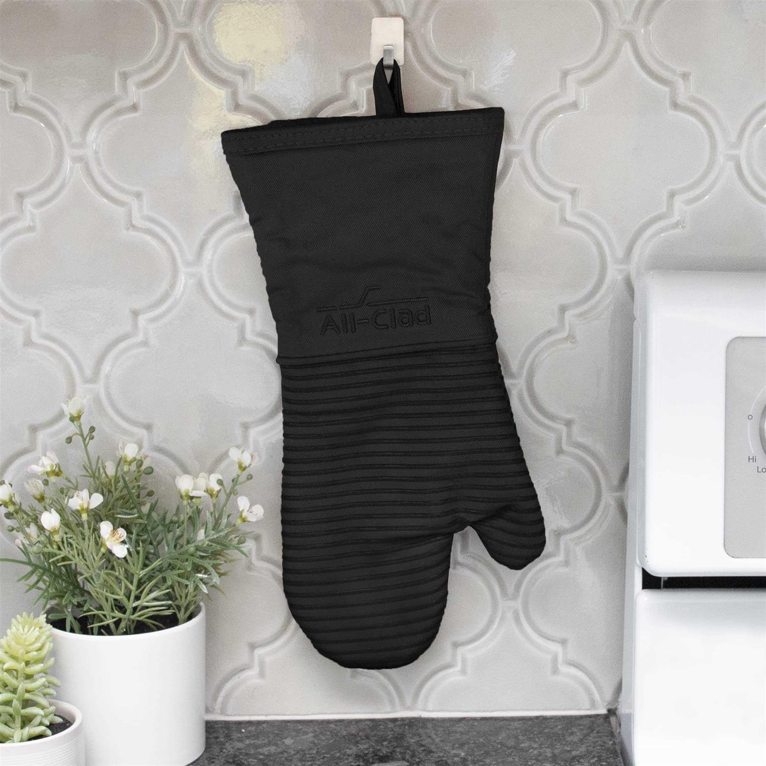 Heavyweight. Durable 100% cotton-twill construction with dual-sided silicone treatment for a confident, left- and right-handed no-slip grip. Take the heat. Heat protection up to 500? (260?). Firm but flexible. All-Clad Silicone Oven Mitts offer a firm grip along with premium flexibility that conforms to different shapes. Available in a variety of lively colors to fit your personal palette. Machine wash.