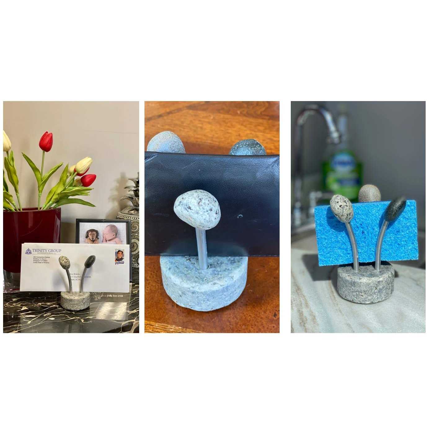 The subject was utterly absorbing: how to add an artful touch to a common kitchen cleaning aid. Decorative beach stones and a base cut from salvaged granite connected by three aluminum posts that store your sponge do just that. The durable rubber bottom pad protects your surfaces from scratches. This stylish holder also makes a great wallet valet, inviting cocktail napkin holder, or stylish mail caddy. Handmade by Arra David and Anne Johnson in Windham, New Hampshire. Sponge not included. See the whole story on our blog. Make it a kitchen set, and pair the Sea Stone Splash Sponge Holder with our Sea Stone Spoon Rest. Due to the recycled and handmade nature of this item, each found beach stone is unique and granite color will vary.