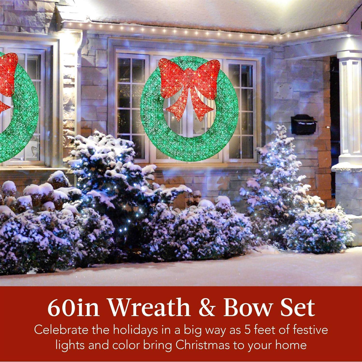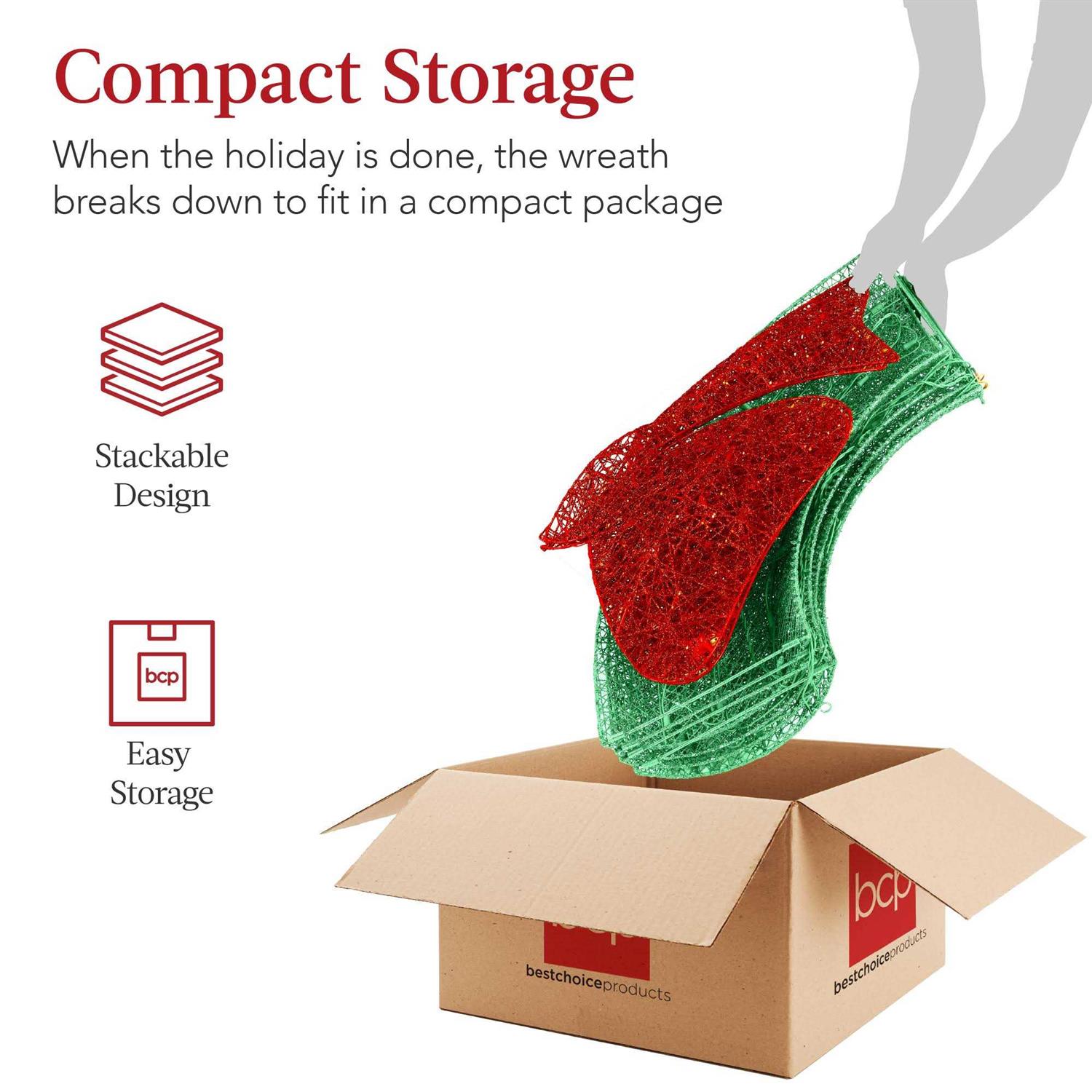 Best Choice Products 60in Pre-Lit Outdoor Christmas Wreath, LED Metal Holiday Decor w/ 206 Lights, Bow – Green/Red