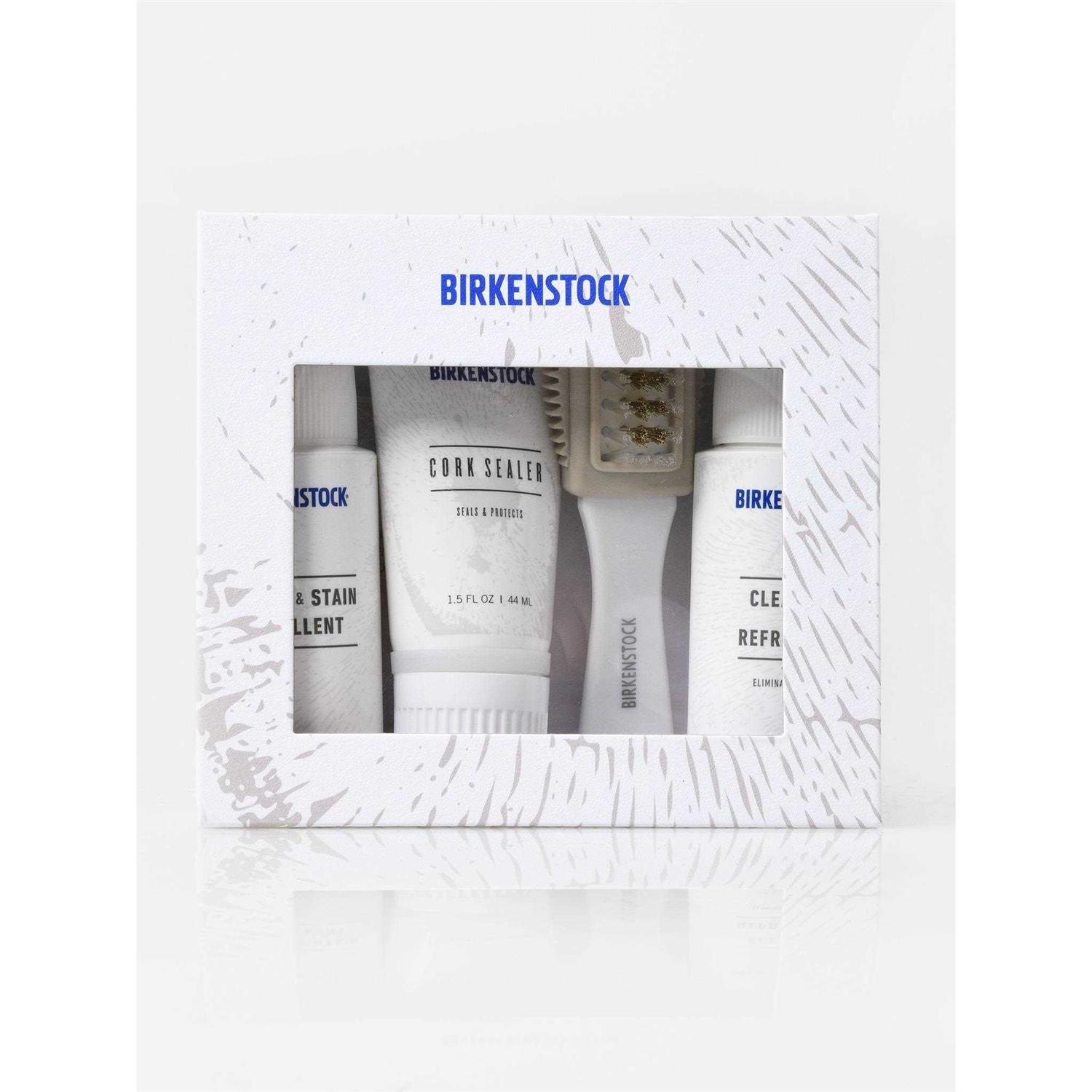 Birkenstock deluxe care kit Comes with: Cork Sealer Footbed cleaner and refresher Sealer and Stain Repellant Multi-purpose Cleaning Tool with brush, sponge and buffer New Birkenstocks come with a light covering of cork sealant which prevents them from drying out. When the cork no longer looks shiny, clean and then apply a thin coat of Cork Sealer to maintain flexibility and good appearance. Seals and protects your investment. A quick application once a month (to the exposed cork only!) will prolong the life of your Birkenstock, or other cork footbed footwear.