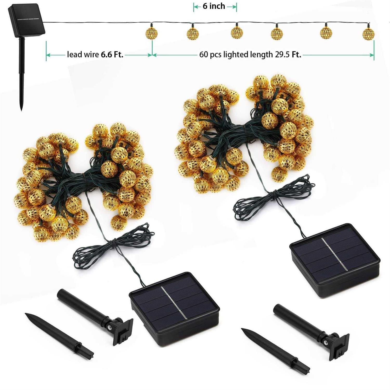 UNIQUE PATTERN DESIGN? Amorous feelings of classical, ornament the room or event by the small shiny golden balls at the daytime and turn them on at night to add some charm and romance. 60 lovely golden metal balls of the outdoor solar lights string waterproof with delicate pattern, starry warm white lighting with an exquisite shadow, creating a cozy and festival mood for your home. | 8 LIGHTING MODES AND MEMORY FUNCTION? Press the mode button of the solar panel and select 8 different lighting modes which include waves, combination, sequential, gradual, chasing flash, slow fade, twinkle flash, and steady on. The built in memory chip of the solar string lights outdoor garden will save your last mode’s setting, so there is no need to repeat settings. | AUTO ON/OFF & ENERGY SAVING LIGHTS? Solar Moroccan ball string lights charged by solar energy, without electric cost and no need to replace the battery. Solar panel with the light sensor controls function, which can make the twinkle lights auto light at night and auto off at daytime. (solar powered string lights can automatically work for 8 to 10 hours after fully charged) | EASY TO USE AND INSTALL? 30 FT outdoor string lights solar powered easy to install with a cable tie or cup hook, fix it or place it anywhere as you need. Please press the ON/Off switch to ON before use it and be sure the solar panel in a sunny location to get more sunshine. | WIDELY USED IP65 WATERPROOF LIGHTS? Warm white led solar string lights camping with IP65 waterproof function, suitable for courtyard, lawn, tent, porch, tree, backyard, table, deck, barbecue, umbrella, fence, pergola, bistro, restaurant, hotel, commercial building, shopping center, dinner, birthday, Christmas, New Year party decor.