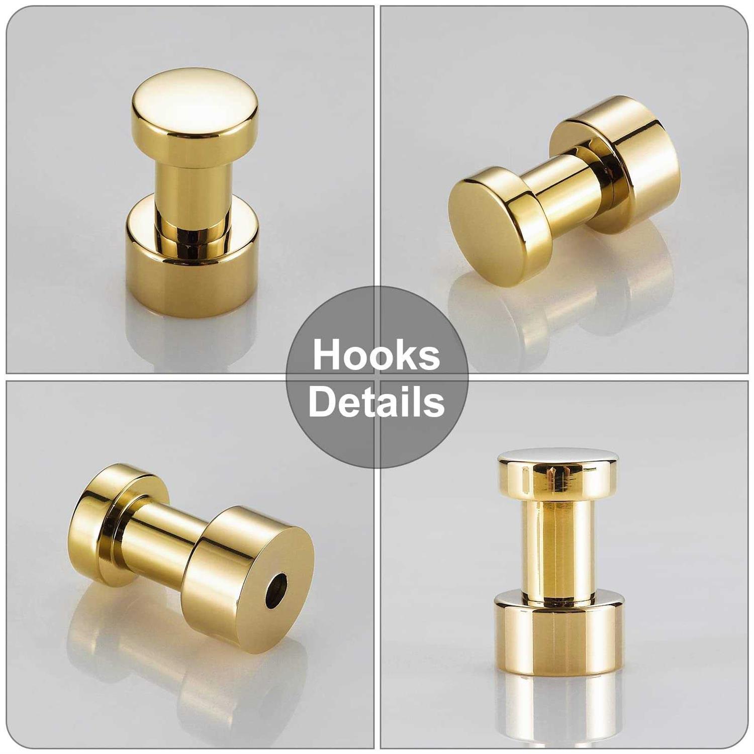 【SMALL SIZE & LIGHT WEIGHT】Overall size:0.67×1.18″(17x30mm) Net weight:0.09lb(43g). Small size and light weight can more generously and conveniently to use. 【STABLE HANGING & NON-FALLING】 Thicker and larger hook, more stronger to prevent items from falling. 【FASHION DESIGN & CLASSIC STYLE】Stylish smooth appearance, soft touch without scratches your hands, clean silhouette with minimalist style coordinate with morden house and optimizing available space. 【SOLID AND QUALITY BRASS CONSTRUCTION】high-grade brass construction, well engineered for increased durability, resists corrosion and tarnish, helps to maintain the brilliance of the surface. 【EASY INSTALLATION】Use included glue to install the hook in minutes. Or you can screw-mount it with stainless steel screws and anchors. Max Load: 5 KG screw-mount on solid concrete wall. Material :Brass Color: Golden Anchor : high quality non-recycled material Installation Method : Wall-mounted Package Includes: 5 Hooks,mounting hardware Care and Maintenance It with a soft damp cloth, don’t use any detergents. Keep maintaining every 1-2 months regularly. Warm Prompt All photography props are not included in the package. There may be a little color aberration due to different monitor display and light influence. Due to manual measurement, there may be a little dimensional deviation.