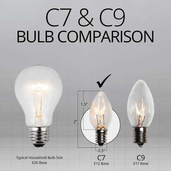 Clear C7 Christmas bulbs, 7 watt, E12 – Candelabra base. Commercial grade bulbs with average lifetime of 3,000 hours. Higher watt bulbs increase illumination, casting brighter light. Nickel plated bases prevent corrosion and improve connectivity, saving you time and money. Transparent bulbs allow light to shine from a visible filament. C7 bulbs measure approximately 2 inches from base to tip. Use with C7 strings, sold separately. Indoor / Outdoor use.