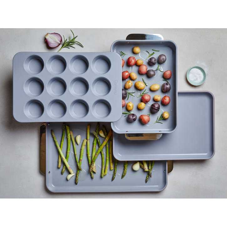Ditch the chemicals with Caraway’s non-toxic Bakeware. Our non-stick coating makes cleaning a breeze. Caraway’s Half Bakeware Set simply includes a 18×13” Large and 10×15” Medium Baking Sheet, 12 Cup Muffin Pan, 9×13” Rectangle Pan, and one pan rack for storage. Caraway is on a mission to craft well-designed, non-toxic ceramic cookware that thoughtfully raises the standards of what you cook with. Simply put, our products are designed to make your life easier and healthier, no matter your level of expertise.