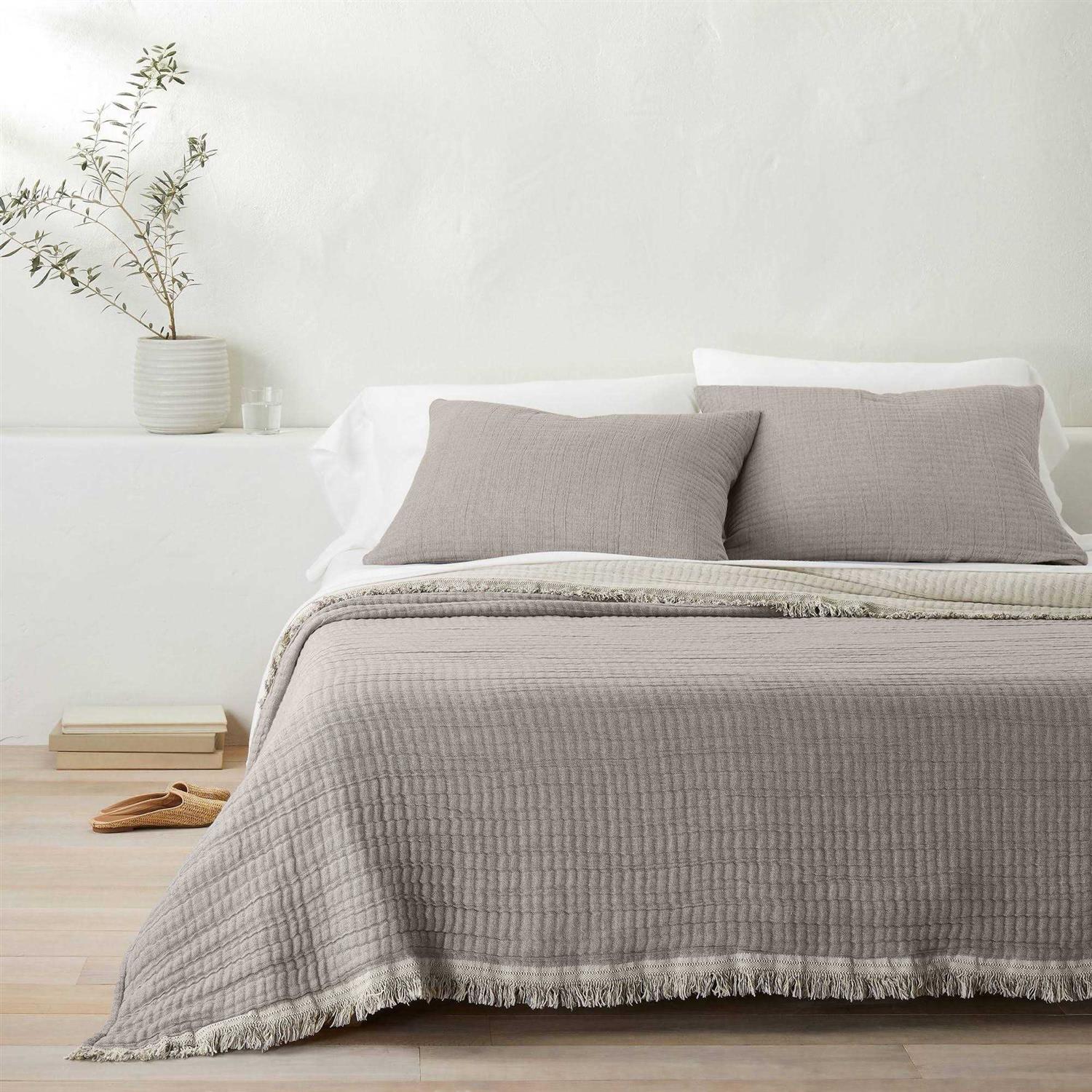 Drape your sleep space in comfort and style you’ll love to relax in with this Reversible Textured Cotton Chambray Coverlet from Casaluna . This reversible coverlet in a solid color makes a versatile addition to the top of your bed. It features an allover textured finish with fringe detailing on the edging for decorative texture and flair. The midweight cotton material offers comfortable use — plus, it’s machine washable for easy care. Pair with matching shams and a sheet set to coordinate your bedding ensemble. Casaluna : Where calm and comfort are naturally at home. Size: King. Color: Dark Gray/White.