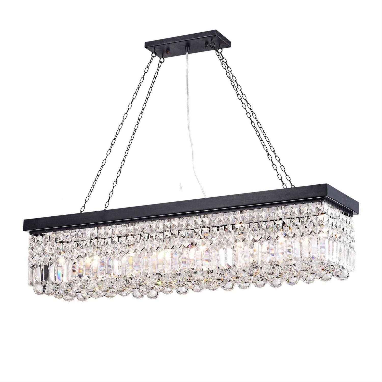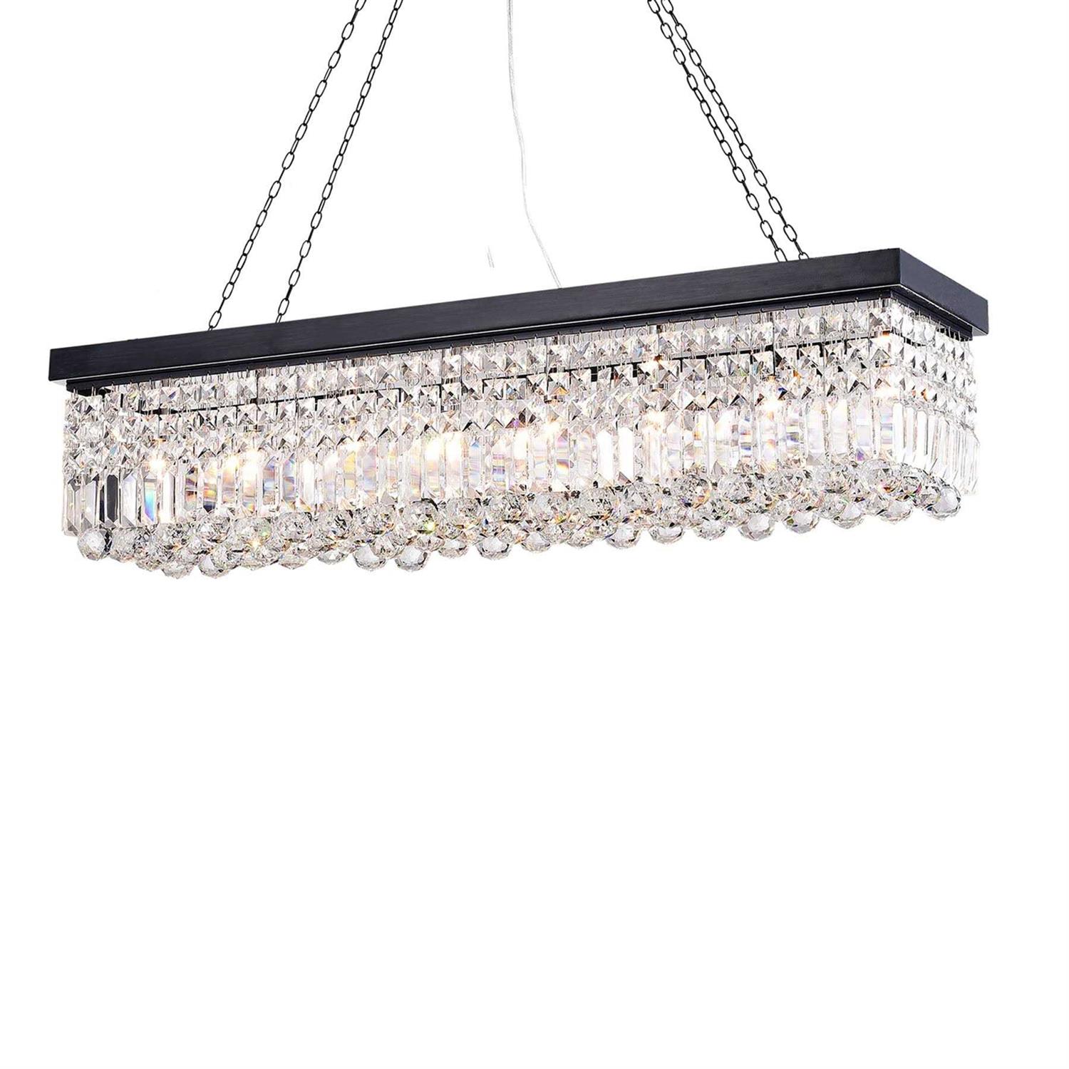 Illuminate your kitchen prep area with this rectangular Cassiopeia chandelier. Dangling crystals reflect and refract light from the eight bulbs for a bright glow in your room, while the chain-hung design lets you mount this chandelier at the ideal height for your space. The black metal frame makes this chandelier sturdy and strong. Features: Crafted of metal and glass Requires eight 40-watt max. light bulbs (not included) Double hanging chains Shimmering glass crystal accents Dimmable illumination UL listed Weighs 34 lbs. Dimensions: Canopy: 9.8 inches wide x 4.8 inches deep Fixture: 9.4 inches high x 39.4 inches wide x 9.4 inches deep Hang length: 30 – 52.8 inches high