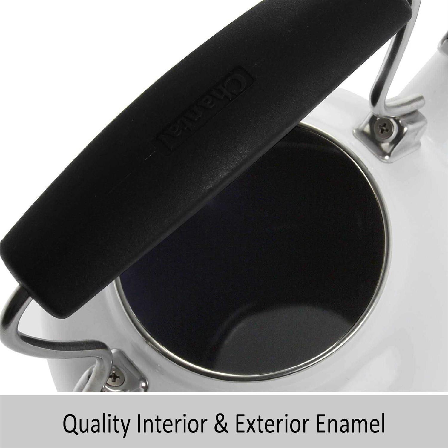 Chantal has always been known for iconic teakettles and is proud to introduce another classic style. A sought after look inspired by traditional stove top designs from the past which have matching enamel lids, the Vintage Teakettle is definitely fresh with a classic twist. It has a black phenolic stay cool grip and knob, a conical spout with one-tone whistle and a wide opening lid for easy cleaning and filling. Premium heavy duty enamel interior resists hard water and calcium buildup. Perfect for all stove tops, including magnetic induction. 1.7 qt. usable capacity.Item Weight – 3 LB7.25 inch exterior base diameter.