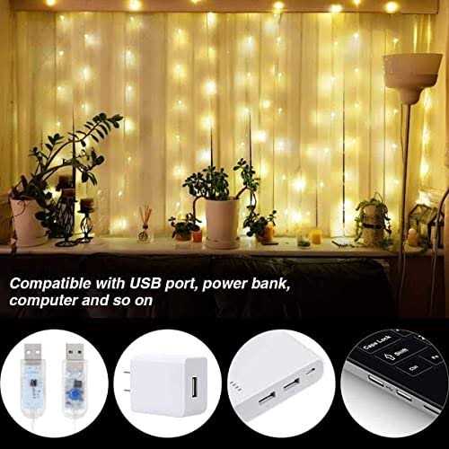 Perfect decoration: Perfect for indoor lights decorations. Christmas, Party, Valentine’s Day, Holiday, Home, Window, Wall, Bedroom, Livingroom etc. Remote controlled&Timer: Use remote controller to switch combination, in waves, sequential, slogs, chasing/flash, slow fade, twinkle/flash, and steady on. total 8 flashing mode. Every mode bring you a different mood.You also can adjust the brightness and set timer as you like by remote. Timer is working 8hours and light off 16hours auto. Easy to use: This curtain string lights uses USB power supply, a total of 10 strands of copper wire, each copper wire has 30 LEDs and a hook, can be easily hanging in the window or wall. Safe to Touch: Using high quality copper wire, 5V safe voltage, long time use will not overheat. IP44 Waterproof: This hanging wall string lights is waterproof (IP44), is great for outdoor wall lighting. The wire parts of the string lights are fully sealed, thus making it submersible, but the USB is NOT waterproof, so please keep USB away from water.