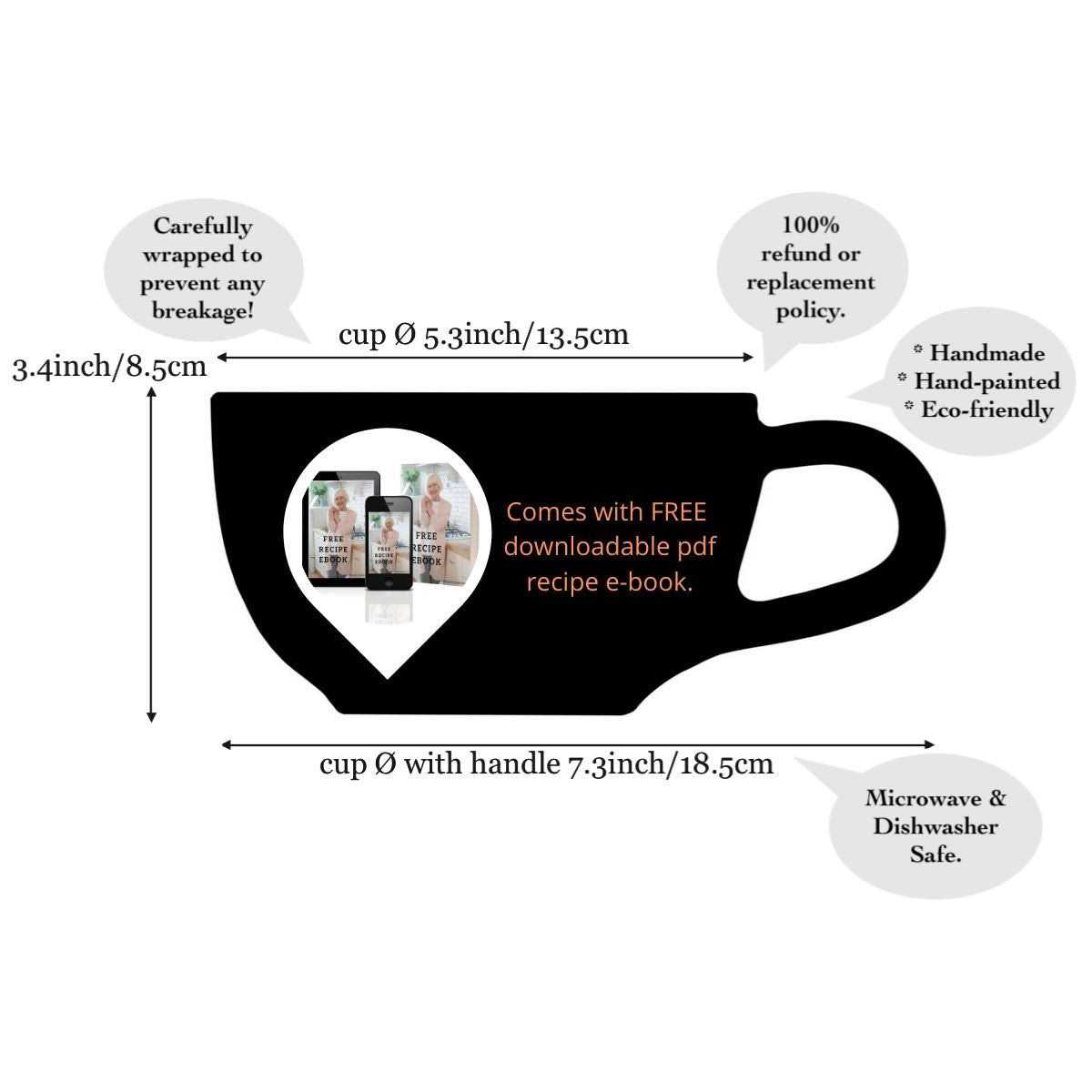 This large 500ml mug is definitely larger than the ones you are used to and you probably already own. But this allows you to enjoy a strong tea but perfectly balanced by the amount of water you can put in it. This mug has a wide, easy-to-reach handle that won’t squeeze your fingers and thus allows you to have a strong grip. The base of the cup is not varnished giving you a non-slip experience so no splashes or stains while maintaining this retro and elegant style. Each piece is made and painted by careful hands to ensure you have a luxurious and quality experience at every meal with your family and friends. Our products are suitable for use in the microwave and dishwasher, saving you the time spent cleaning in the kitchen for more leisure time, fun and relaxation. Use this product comfortably in your home while knowing they are environmentally friendly to and contribute to a sustainable and sustainable future. Our range is environmentally friendly and produced by the use of solar panels to heat pottery and thus protect the forests.