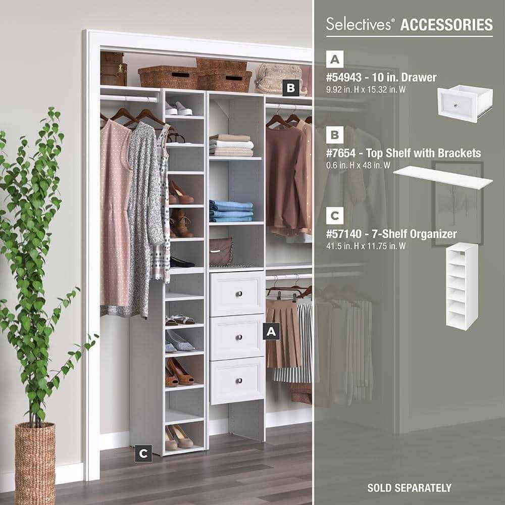With both shelf space and hanging space the ClosetMaid Selectives 16 in. White Custom Closet Organizer is a perfect start to redefining closet storage. Featuring 3 closet rods that expand from 30 in. to 48 in. to fit a variety of closet sizes; this starter kit offers durable laminate construction with a white finish for years of sturdy use. The 6 shelves help organize and increase the usable space in your closet perfect for shoes clothes toys or accessories.