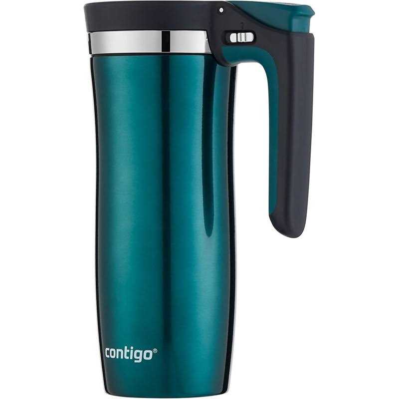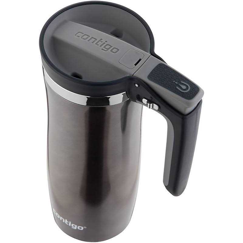 Sip confidently knowing your Travel mug’s AUTOSEAL technology is Leak- and spill-proof. Drinks stay hot up to 5 hours or cold up to 15 hours thanks to THERMALOCK vacuum insulation. Convenient one-handed drinking from either side of the lid with the push of a button. Carrying handle makes it more comfortable to take your mug on the go yet still Fits in most cup holders. Button lock on lid prevents accidental opening for added peace of mind. Easy-clean lid opens completely for thorough cleaning and is top-rack dishwasher-safe; hand-wash-only stainless steel body. Our innovative engineers hate stains as much as you do. Thats why, when designing the Contigo Handled AUTOSEAL vacuum-insulated stainless steel travel mug with easy-clean lid, they made sure to include our patented AUTOSEAL technology, eliminating the possibility of spilling or leaking your drink whether youre at home, in the office, or on the go. They integrated a comfortable carrying handle into the lid without sacrificing the slim Silhouette that lets your travel mug fit nicely into most cup holders, so its even easier to take a days worth of your favorite Coffee or tea with you. Not to worry, Thermalock double-walled Vacuum insulation means your beverage will stay piping hot up to 5 hours or icy cold up to 15. Use the discreet lock feature to prevent the unintended pressing of the AUTOSEAL button for added Peace of mind. At the end of a long day, the top-rack dishwasher-safe easy-clean lid pops open completely so you can get into all the nooks for a thorough clean. Just remember, the stainless steel body is hand-wash-only.