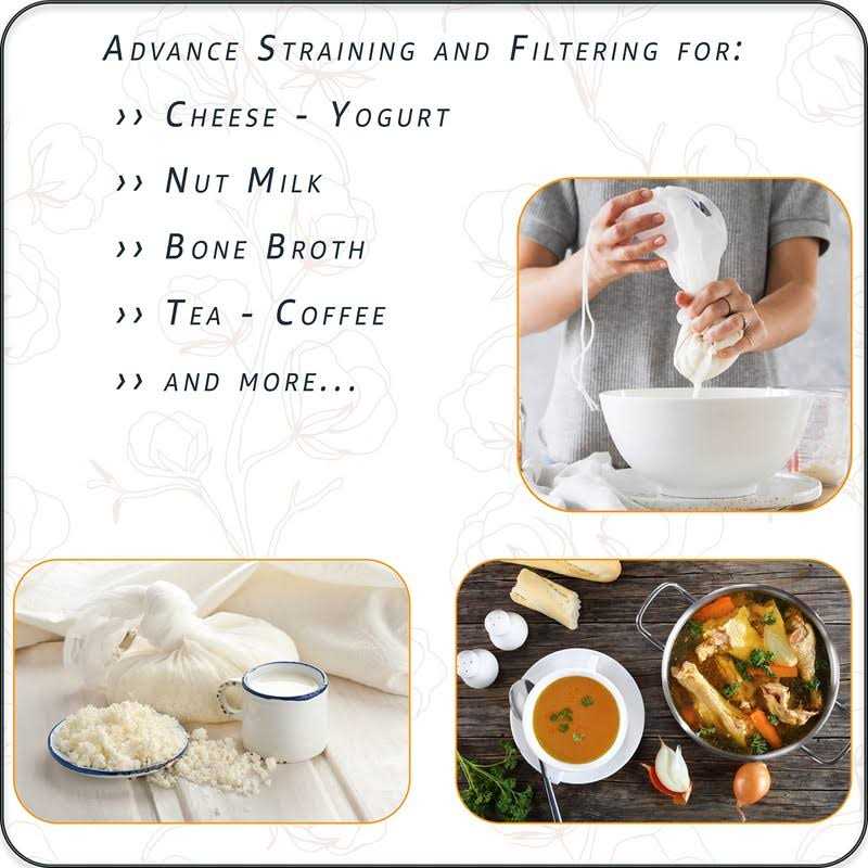 For Cooking and Basting: Soak the cheesecloth in butter, wine or both! Spread it evenly over the already seasoned breast and about halfway down the sides of the turkey or chicken. Continue to baste over the cheesecloth with the turkey juices during the cooking process. Carefully remove the cheesecloth and discard for the last 30 minutes to allow the skin to brown. For Straining: Use to strain solids from liquids when making bone broth, honey, oil, tea, kombucha, cold brew coffee, juice, wine, beer, butter, milk, tofu, rice, vegetable, queso, nut milk, wrap, jelly, water, soup stock, gravy, yogurt, sauces, jams. Cheese Making When making cheese, use Cotton Farm reusable Cheese cloths to remove whey from cheese curds, and help hold the curds together as the cheese is formed. It protects the cheese while allowing it to breathe during the aging process. Also use Cotton Farm reusable cheesecloth to form and age Christmas Pudding and fruit cake. Other Uses There are 100’s of uses for Cheese Cloth in the kitchen and around the home. Use for everything from dusting powdered sugar, cleaning fresh spinach to crafting and baking. It’s even great for protecting shrubbery. Since it is lint free it’s perfect to use for furniture refinishing, detailing cars, cleaning windows and mirrors.