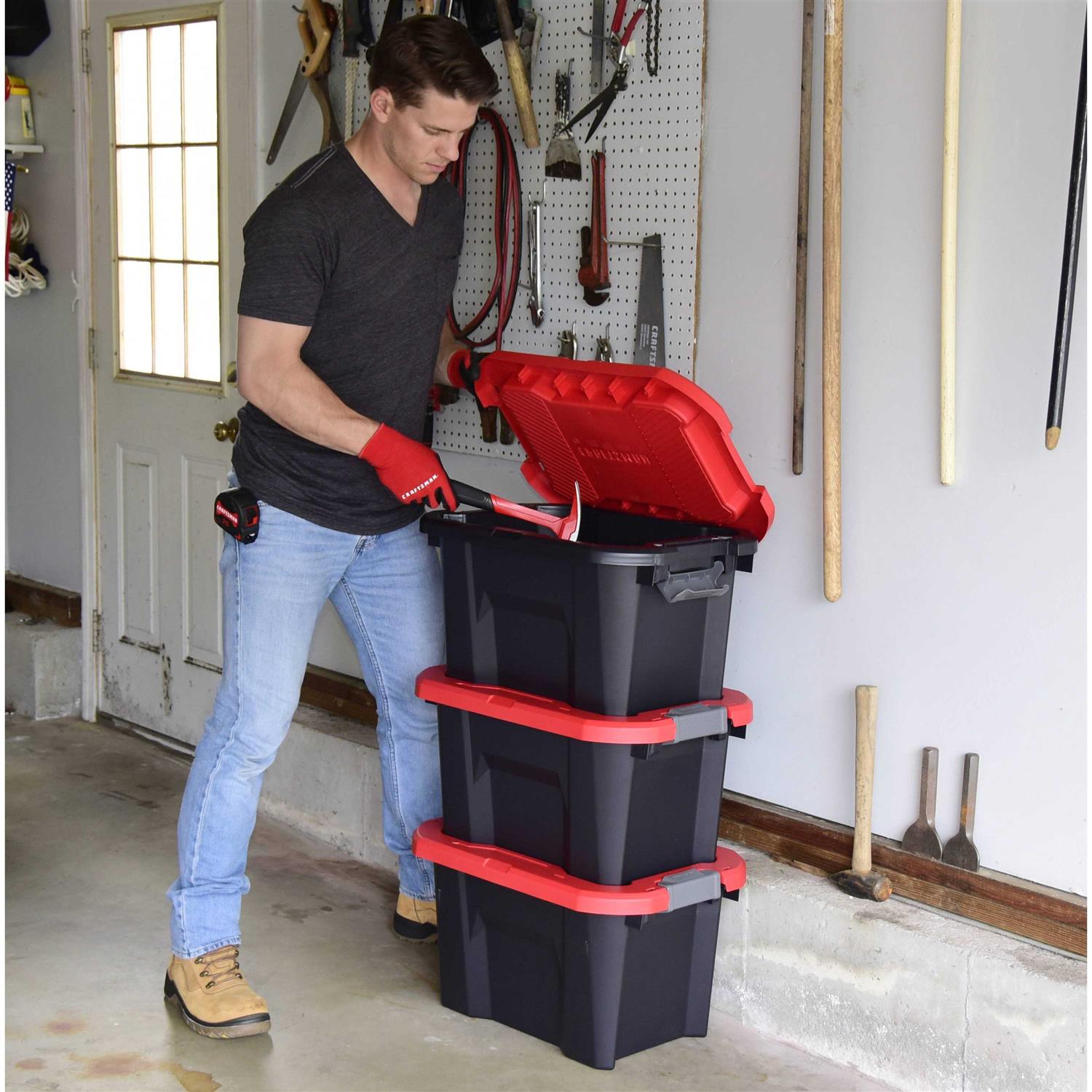 Use this Craftsman 37-L storage container to store shoes, clothes, seasonal holiday decorations, personal items and more. The latching lid secures safely in place. Stack multiple boxes on top of one another and save valuable storage space.