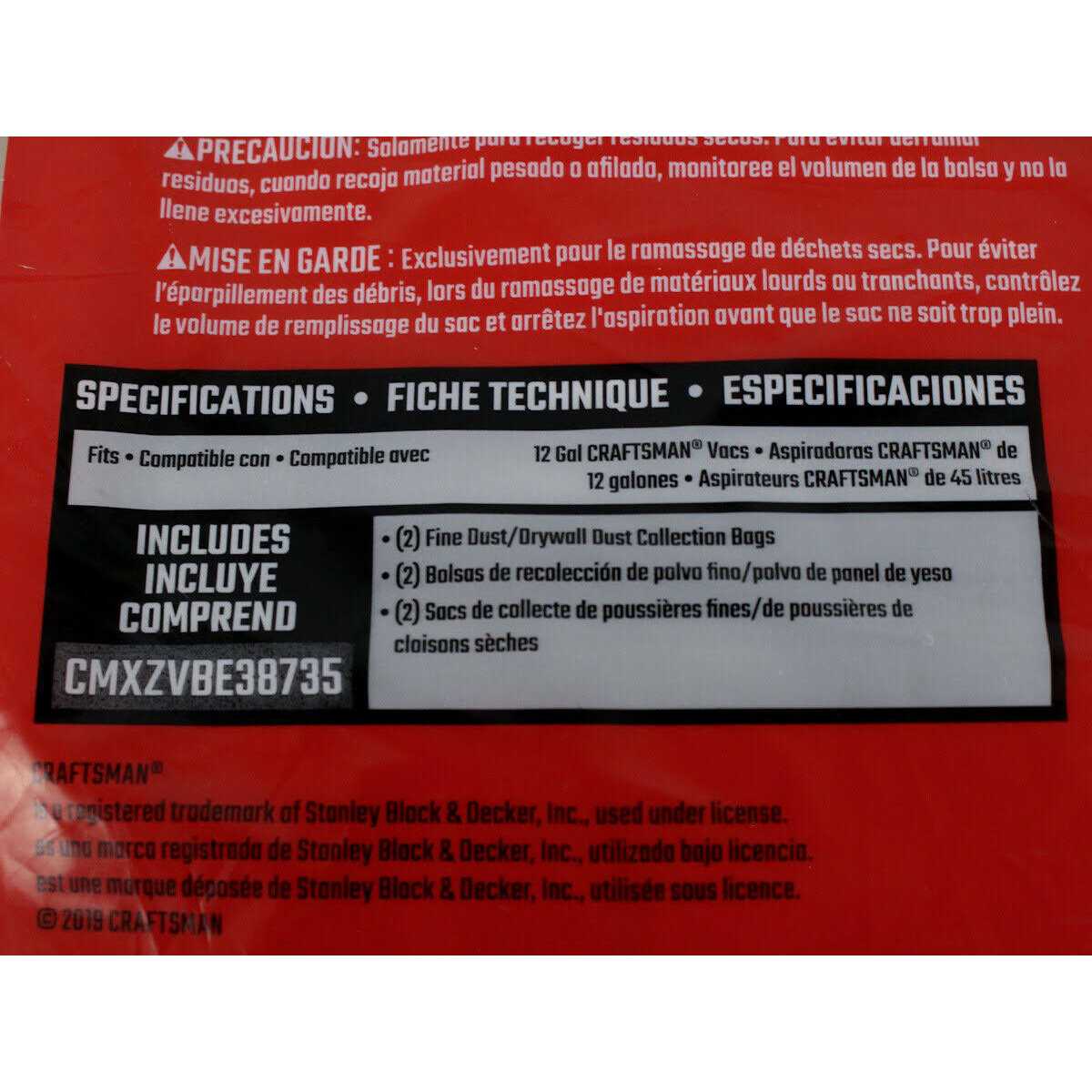 The CRAFTSMAN 12 Gallon Fine Dust/Drywall Dust Collection Bags for wet/dry vacs are designed for pick-up of drywall dust, cold ashes, ultra-fine particles and other dry debris pickup. They help contain all the debris from your home improvement projects, big or small, and keep your vac from blowing the fine particles back into the air. Bags are easy to install and even easier to toss away. Includes 2 dust bags.
