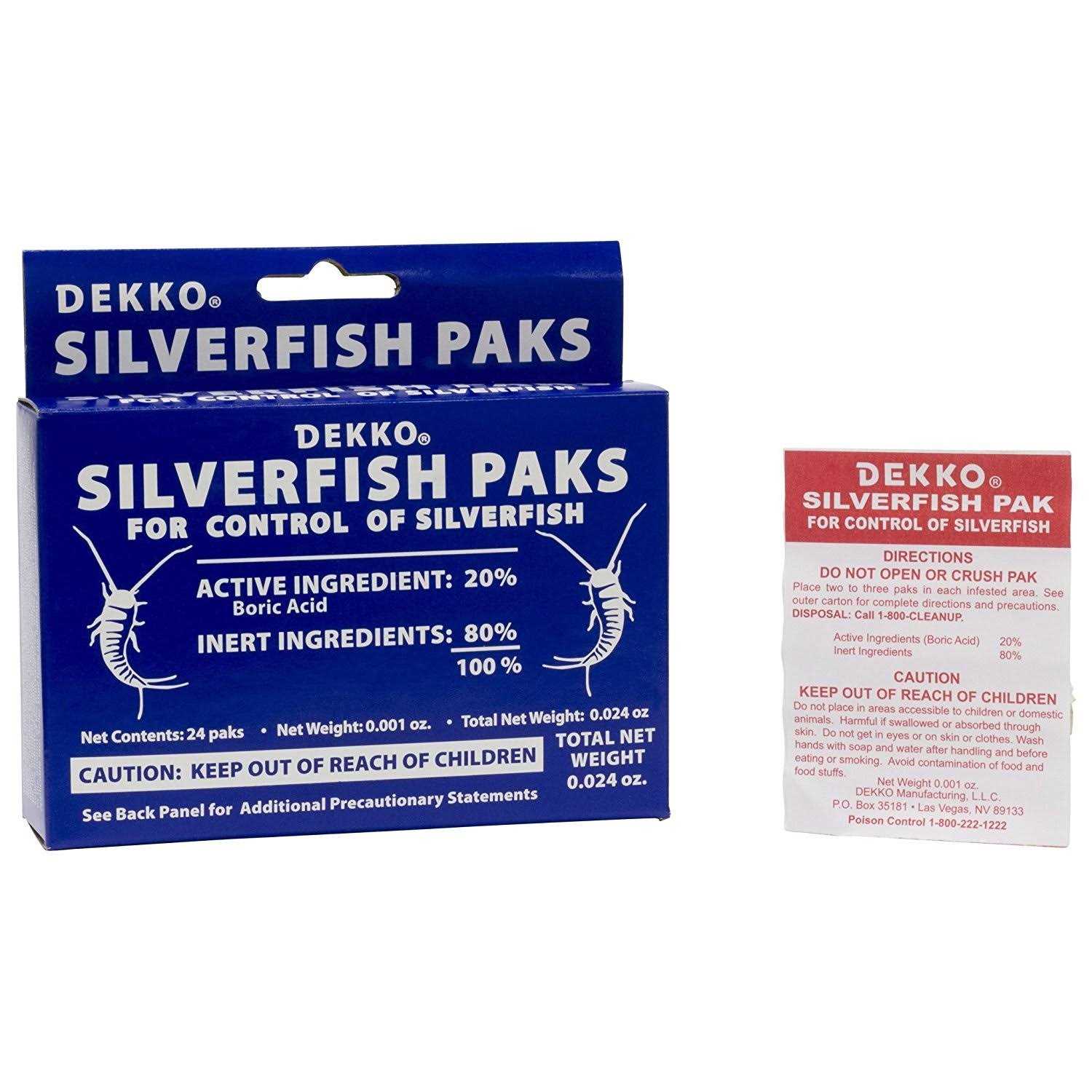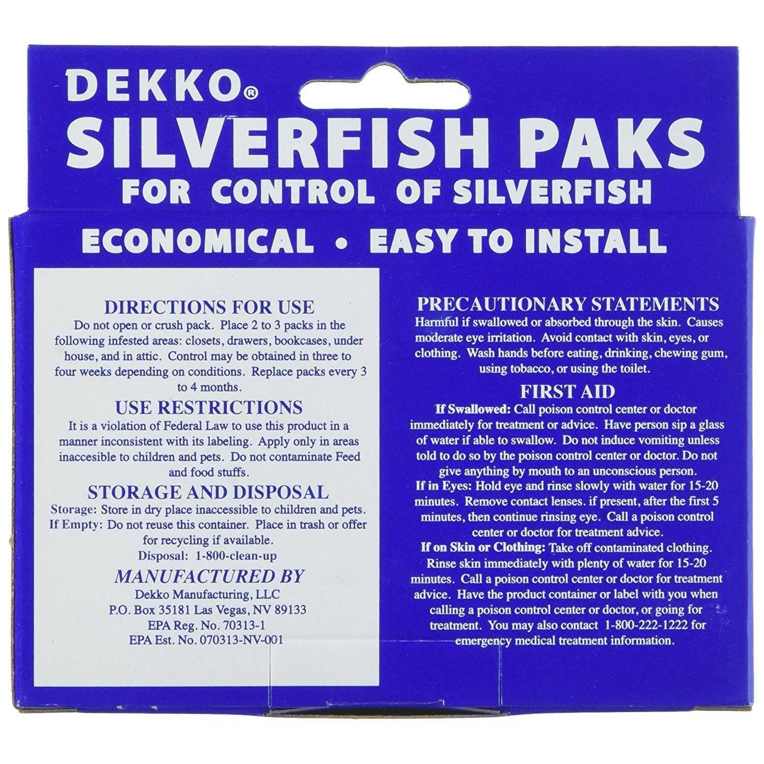 Place in closets, drawers, bookcases, in basement and dark hidden areas. When Dekko Silverfish packs are used as the only treatment, control may not be obtained from 3 days to 4 weeks depending on conditions. Replace Packs as necessary to affect and maintain control Made in the USA This silverfish packs are an economic and easy way to control silverfish. Silverfish simply eat through the pack and ingest the poison inside. Place two to three packs in each infested area you are trying to control. Silverfish may take several days to a few weeks to control, depending on conditions. Place in closets, drawers, bookcases, in basement and dark hidden places. Also in areas where silverfish inhabit, under house and in attic if possible. When Dekko silverfish paks are used as the only treatment, control may not be obtained from three days to four weeks, depending upon conditions. Repeat treatment as necessary to affect and maintain control. Replace every three to four months from date of purchase