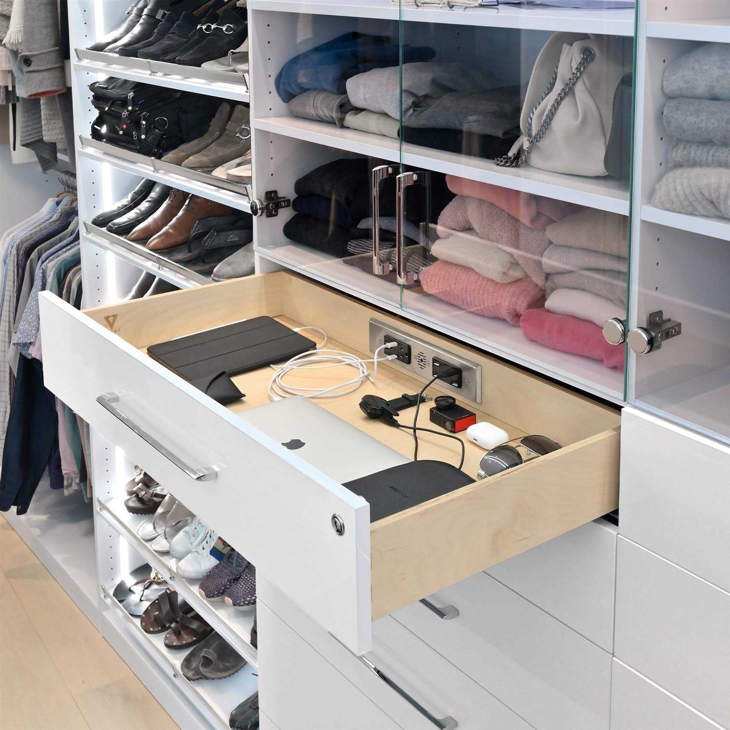 Install Docking Drawer Blade Series outlets into any drawer to create purposeful and functional spaces that eliminate countertop cord and device clutter. SMART Offers both charging AND powering capabilities in a single solution. SIMPLE Designed in one size for any drawer type, this outlet plugs directly into the wall with a 4.5′ cord, simplifying electrical planning and lowering project costs. SAFE Certified for use in the US and Canada. Featuring an interlocking thermostat that de-energizes the outlet when the surrounding temperature exceeds 120F.