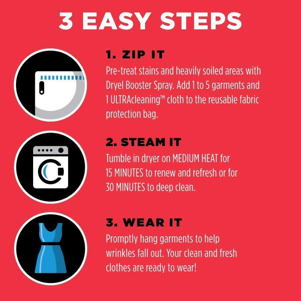 Dryel’s at-home dry cleaner works better than any other. Dryel harnesses the power of steam to gently and effictively clean your special care clothes. Skip the hassle, expense and harsh chemicals of the dry cleaner and choose Dryel for all of your dry cleaning needs. Our at-home dry cleaner is compatible with standard and HE machines, making it perfect for every household. With included stain & odor removal spray and on-the-go stain removal pen, Dryel can save you up to 90 percent of the cost of dry cleaning. With 3 easy steps, Dryel provides you with a ready-to-wear look in as little as 15 minutes. (Bag NOT included with Refill Kit, please purchase Starter Kit for Bag) Age Group: adult.