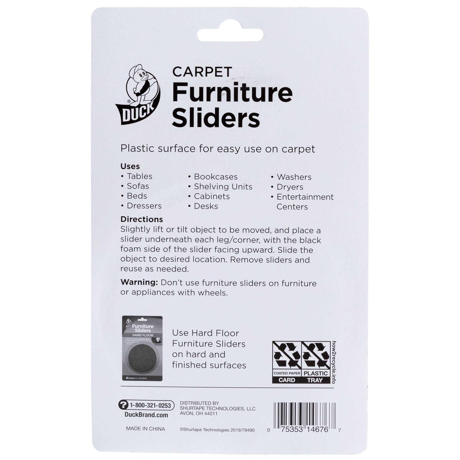 Get the help you need when moving or rearranging furniture with Duck Brand Furniture Sliders. Perfect to handle those larger, heavier objects in your home, these handy sliders are designed specifically to move on carpet easily without any damage to your floors or furniture. Whether redecorating, cleaning, organizing or moving, simply place the sliders under the object and get moving without any additional help or paying movers to do it for you. Its that easy. These sliders are designed specifically to move or adjust furniture without any damage to your floors.