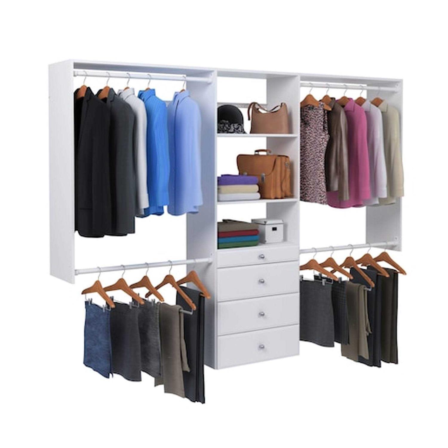 Closet storage tower system hangs on a steel track and mounts to the wall for a convenient set-up. Includes 4 drawers, 6 shelves, and 4 rods to store all of your clothing, shoes, and other personal items. Wooden closet system features 1 4-inch drawer and 3 8-inch drawers with full-extension that all easily glide with full-extension for easy access. Coated with durable and thermally-fused laminate for long-lasting use and beauty. Kit includes all necessary hardware for an easy installation process.