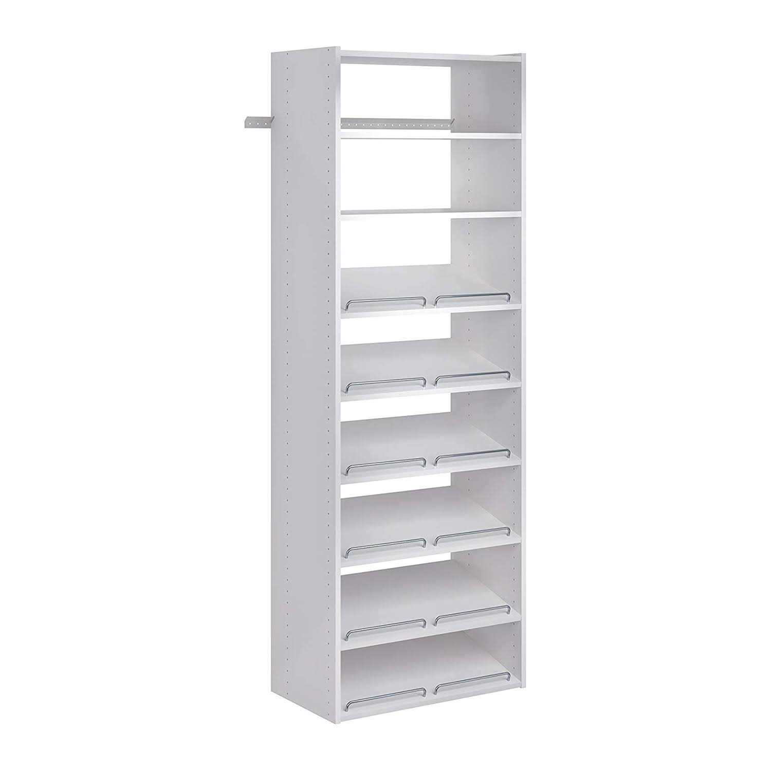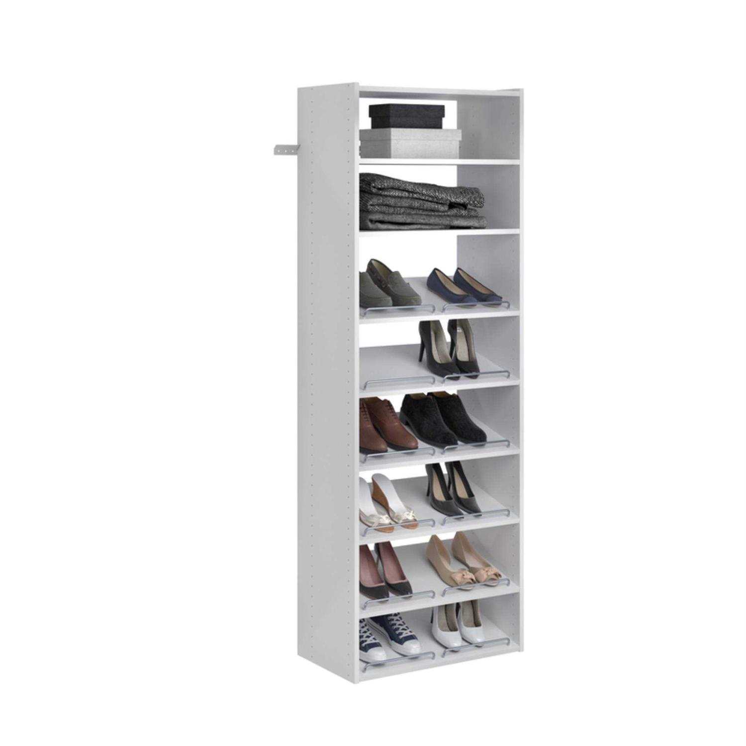 Use this Easy Track Closet RS1600ON White Shoe Shelf to expand your storage with a unique space design all your own. Combine multiple units to make your space more versatile than ever. This 24 inch shelf set has a convenient fenced edge so shoes stay in place more securely. Install this item to give yourself more efficient storage for your collection.