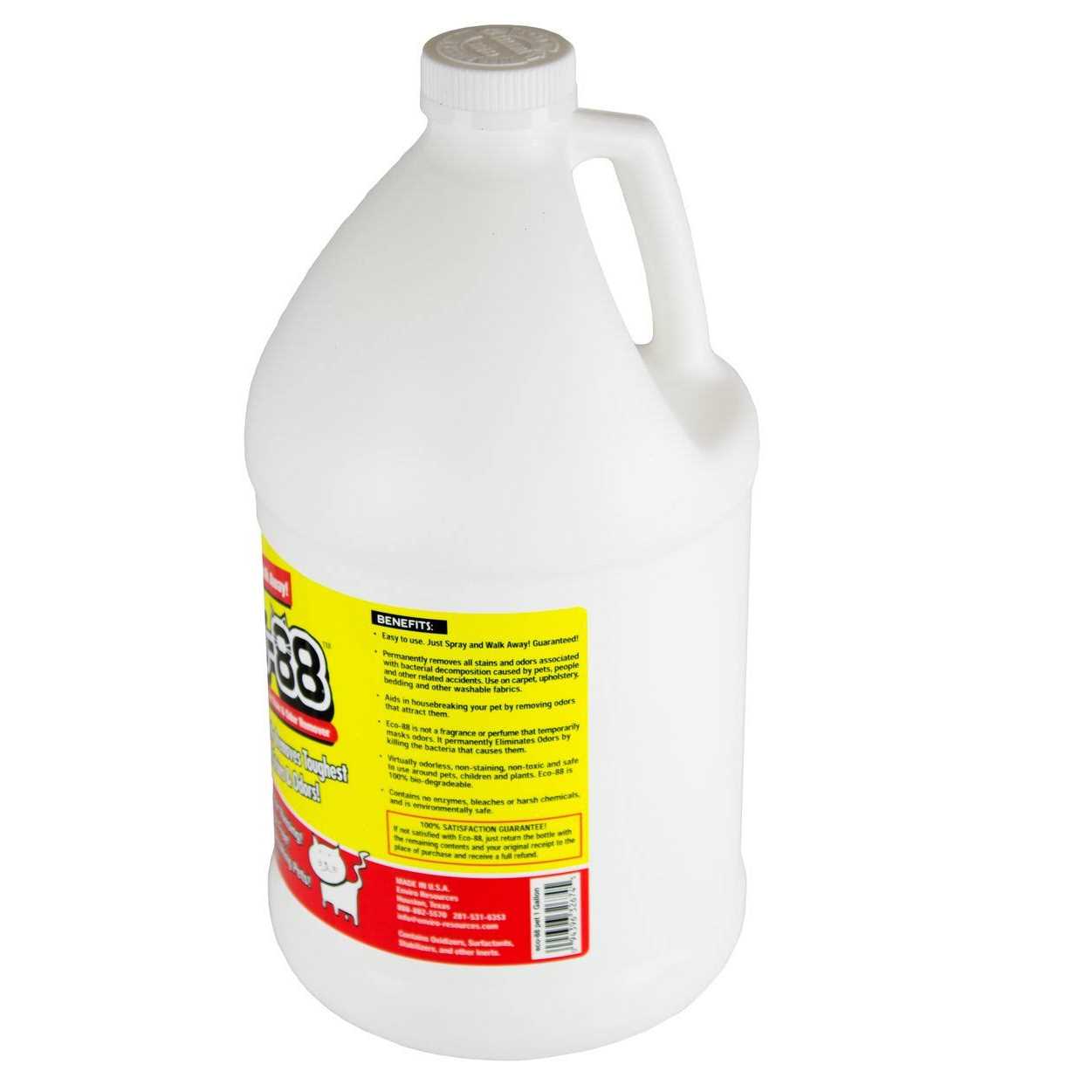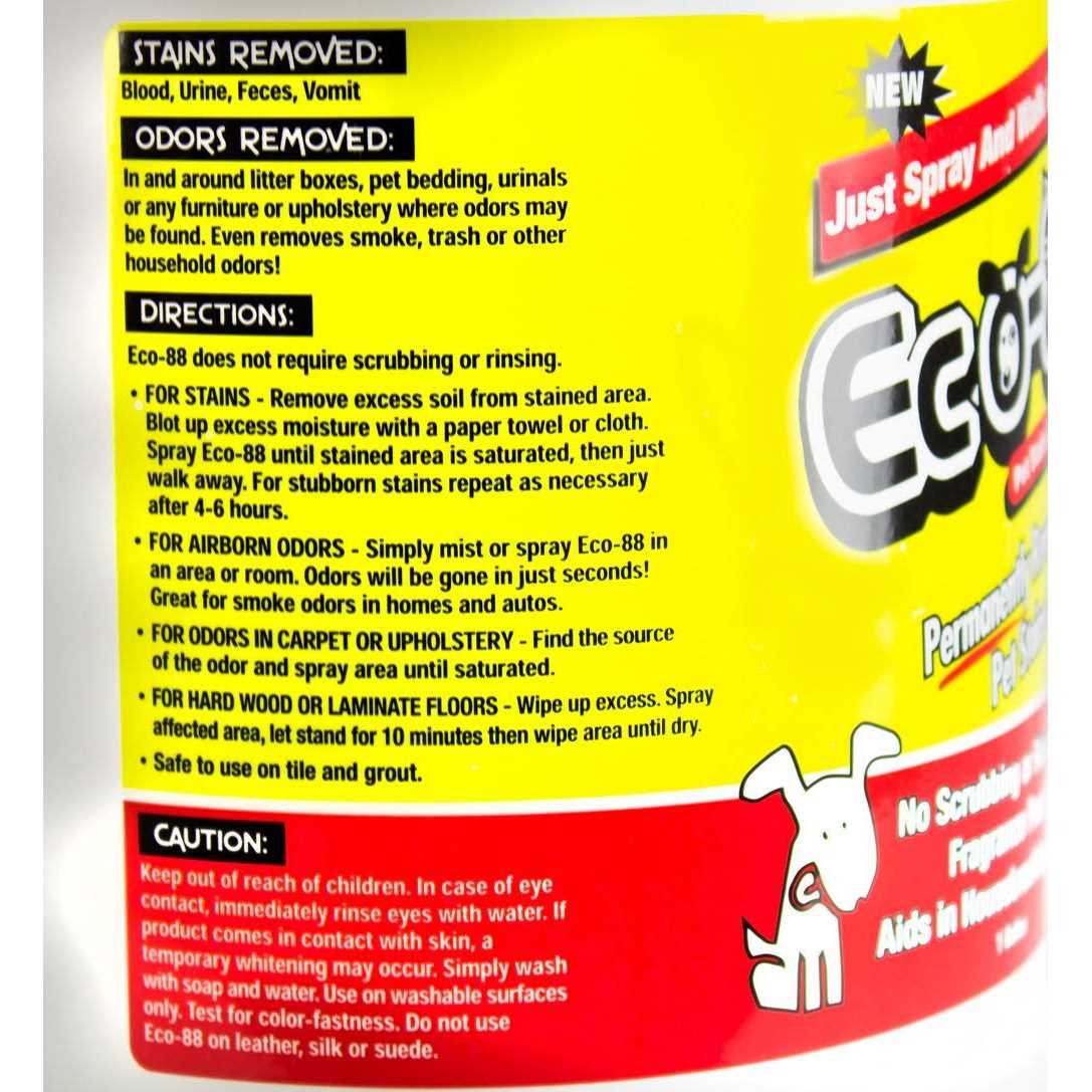 A revolutionary new product especially made to permanently remove all stains and odors associated with bacterial decomposition caused by pets, people and other related accidents. Eco-88 requires no scrubbing, rinsing or blotting. Just spray Eco-88 on stain and watch those stains and odors disappear like magic. Features Removes both stains and odors caused by urine, feces, vomit and blood; from carpets, upholstery, bedding, and other washable fabrics. blood; from carpets, upholstery, bedding, and other washable fabrics. Effective for controlling odors found in and around litter boxes. Aids in housebreaking your pet by removing odors that attract them. Is not a fragrance or perfume that temporarily disguises or hides odors, but a permanent odor eliminator. odors, but a permanent odor eliminator. Completely odorless, non-staining, non-toxic and safe to use around pets, children and plants. Contains no bleaches, and is environmentally friendly. Does not contain any enzymes that just work only under certain conditions.