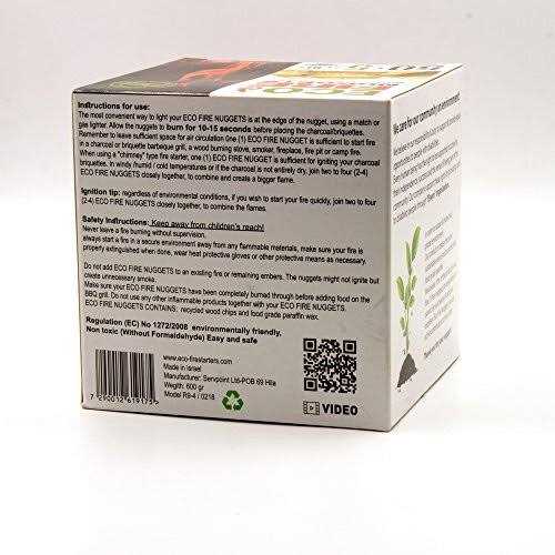 Charcoal Starters by Eco Fire. Details:Starting a fire was never easier, safer and Eco-cleaner! Eco Fire Nuggets is the perfect solution for quick and effective lightning of coal, fireplaces, wooden stoves, camping, fire pits and more. The result: strong fire and perfect flame for 10-12 minutes, achieved quickly, efficiently and safely. Eco Fire Nuggets are manufactured from sustainable wood sources (pine tree) and food grade paraffin wax to ensure powerful combustion and safety at all times.
