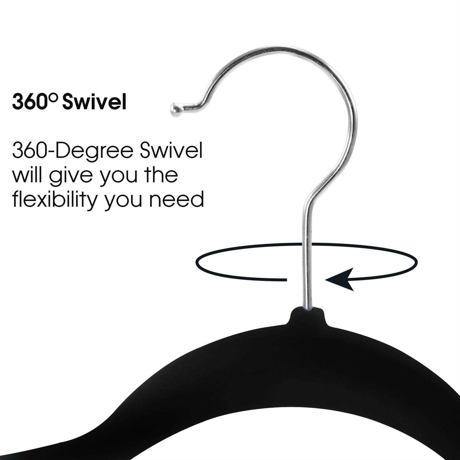 The Elama pink flocked velvet hangers are durable and sturdy, designed to hold large and heavy pieces of clothing. It’s stronger and much more lighter than wooden hangers, but much sturdier to hold heavier and bulkier clothes without bending. These hangers are a great choice for suits, coats, skirts, shorts dresses, sweater, pants, belts, ties, shawls, thin strap shirts, tanks and women undergarments, camisoles and all your winter clothes. The Elama flocked velvet hangers feature a non slip and supreme soft luxurious velvet feel instead of plastic or metal. It holds clothes without falling or sagging and leaving your clothes crease and wrinkle free. The contour shoulders prevents widening of the neck and clothes from slipping off the gentle yet firm non-slip surface hanger. Flocking also does not shed or fade onto your clothes, leaving your clothes looking as fabulous as the day you hung them. Why do our hooks swivel. Because each Elama flocked velvet hanger has a nut at the bottom of the hook so they can rotate 360 degrees by a simple twist without drop out. The designed swivel hooks enable you to sort through your clothes easily no matter which direction they hang. The swivel hooks are securely attached to the clothes hangers, so you can hang heavy clothes and the hooks will not snap off or break. The Elama Flocked Velvet hanger have a 0.2 inch thickness, making these velvet hangers slim and sleek while you double maximize and organize your closet space.