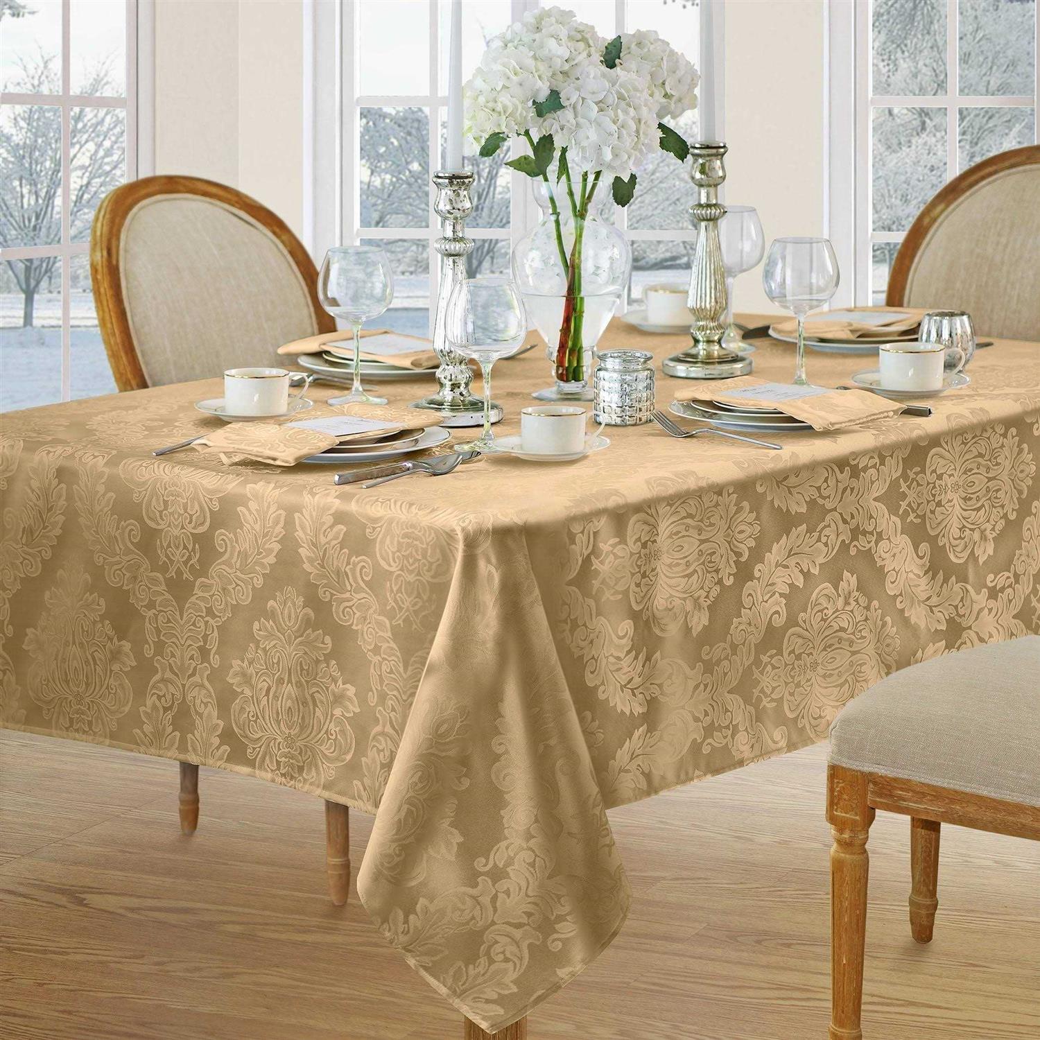 The Barcelona Jacquard Damask tablecloth is the perfect solution to your decorating and table linen needs. Delicately woven jacquard damask design gives it the versatility of a solid, with a touch of fashion. Excellent for special occasions, events, parties, family gatherings and everyday use this table cloth has the soft hand of an ordinary tablecloth, with the added function you need. Fabric features water and stain repellant finish. Silky fabric can be ironed to release stubborn creases and make your tablecloth wrinkle free. Hemmed edge adds a finished look and prevents wear and tear. Available in a large selection of table shapes and sizes to fit all your entertaining needs. 100percent Polyester. Easy care, machine washable.