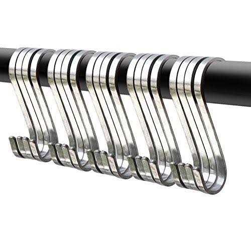 EFFICIENT STORAGE SOLUTION: These heavy duty s hooks are a simple and brilliant storage solution for hanging anything in your kitchen,closet, workshop or garage where space is limited,just simply hang them on pot rack,wall rails or shelves.With these S hooks you can easily organize your kitchenware,pans,pots,utensils,spoons like a professional chelf. Get everything within your arm reach,don’t let clutter distract you and waste your precious time. WELL MADE & STYLISH: These S Shaped Hooks are made of premium metal steel, strong and safe enough(smooth polishing no sharp end) without worrying to hurt your hand. With small opening on one end could fit nicely on pot racks or flat wall rails, the other large openning end is perfect to hang cast iron pots, pans, pan lids or coffee mugs. Two size openings for meeting your different needs. WIDELY APPLICATION: These S-hooks are very practical, great for kitchenware and can be applied on the wall to organize such cooking