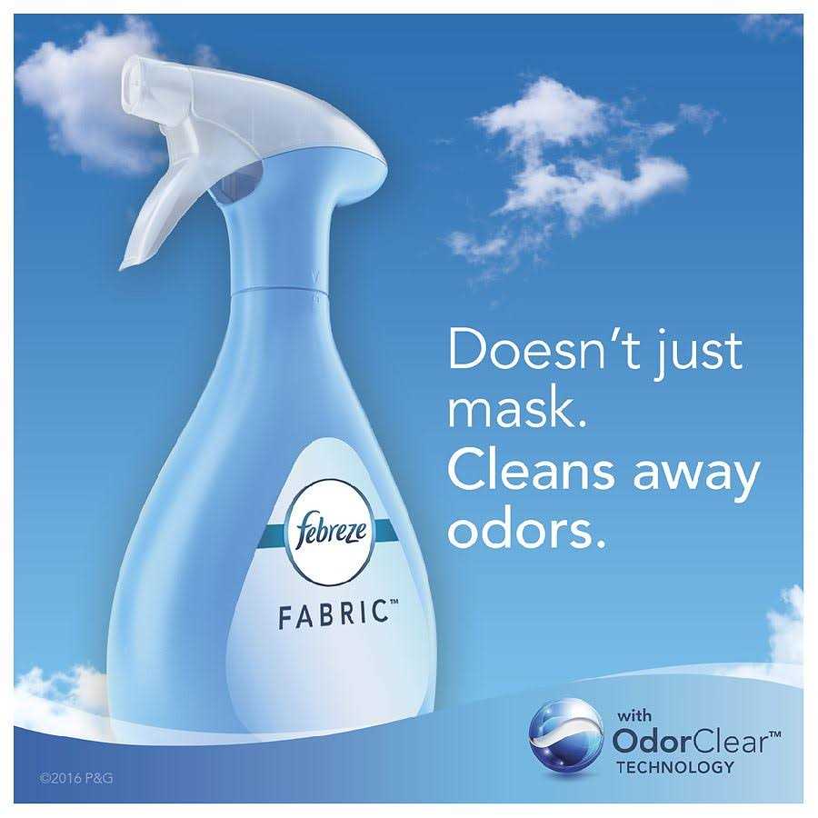 Febreze fabric doesn’t just mask odors, it cleans away odors from fabrics that you wish you could wash with OdorClear Technology, leaving your fabrics with a light, fresh scent. The fine mist works deep in fabrics, cleaning them of common odors such as pet smells, smoke, and body odors, helping to freshen the entire room. Perfect to use weekly on soft surfaces including furniture upholstery and rugs/carpets or simply to give your clothing a needed refresh. Add to your regular cleaning routine for whole-home freshness. With Febreze fabric, uplifting freshness is simply a spray away.
