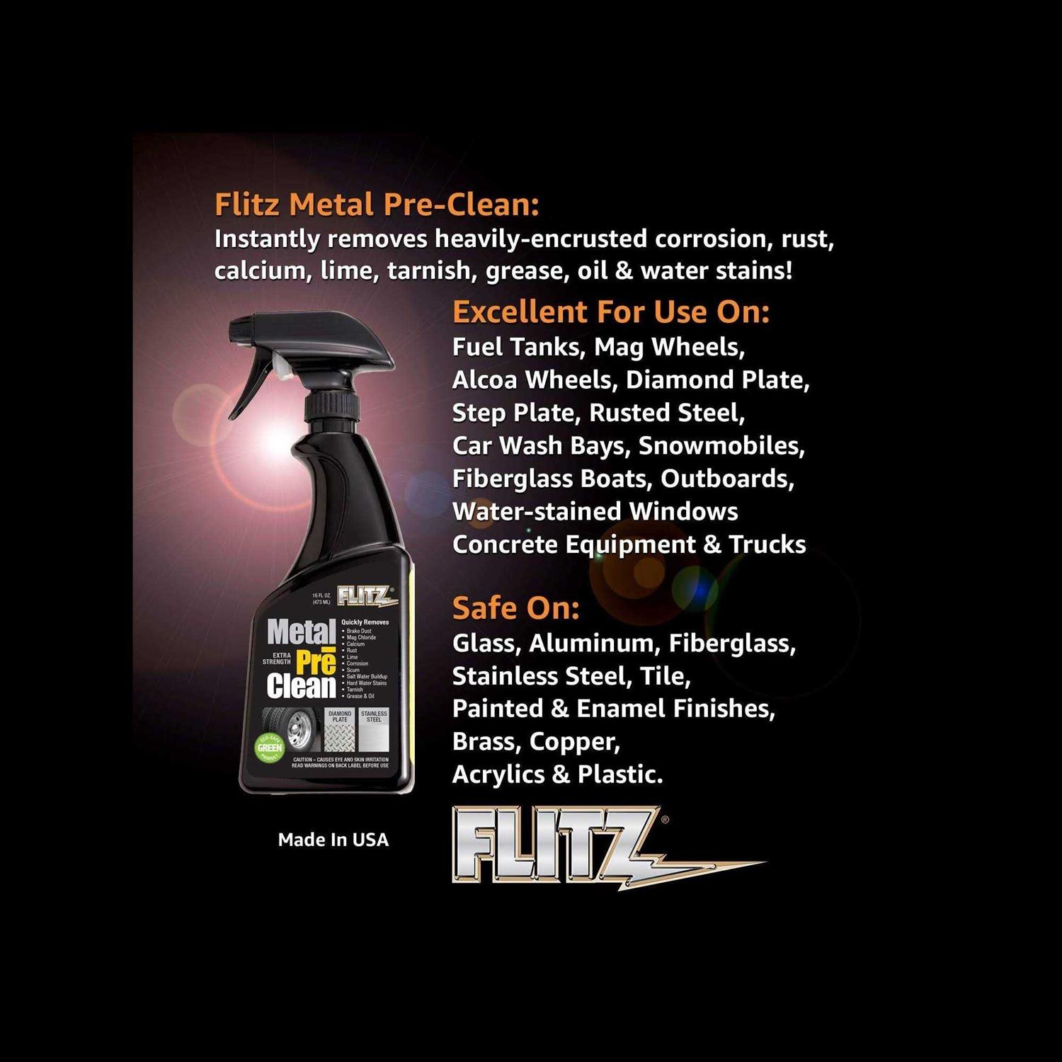 Flitz Metal Pre-Clean is an organic salt formula. It is non-flammable. The Pre-Cleaner is safer than traditional acids. It instantly removes heavily-encrusted corrosion, rust, calcium, lime, tarnish, grease, oil and water stains. Unmatched for its performance on aluminum (will not dull or haze aluminum). It is safe for use on painted and fiberglass surfaces. Safe on to use on glass, aluminum, fiberglass, stainless steel, painted and enamel finishes, tile, brass, copper, acrylics, and plastic. Perfect for use on fuel tanks, engine parts, rusted steel, fiberglass, outboard engines, outdrives, water stained windows. Not recommended for chrome, marble, granite, jura, travertine or terrazzo.