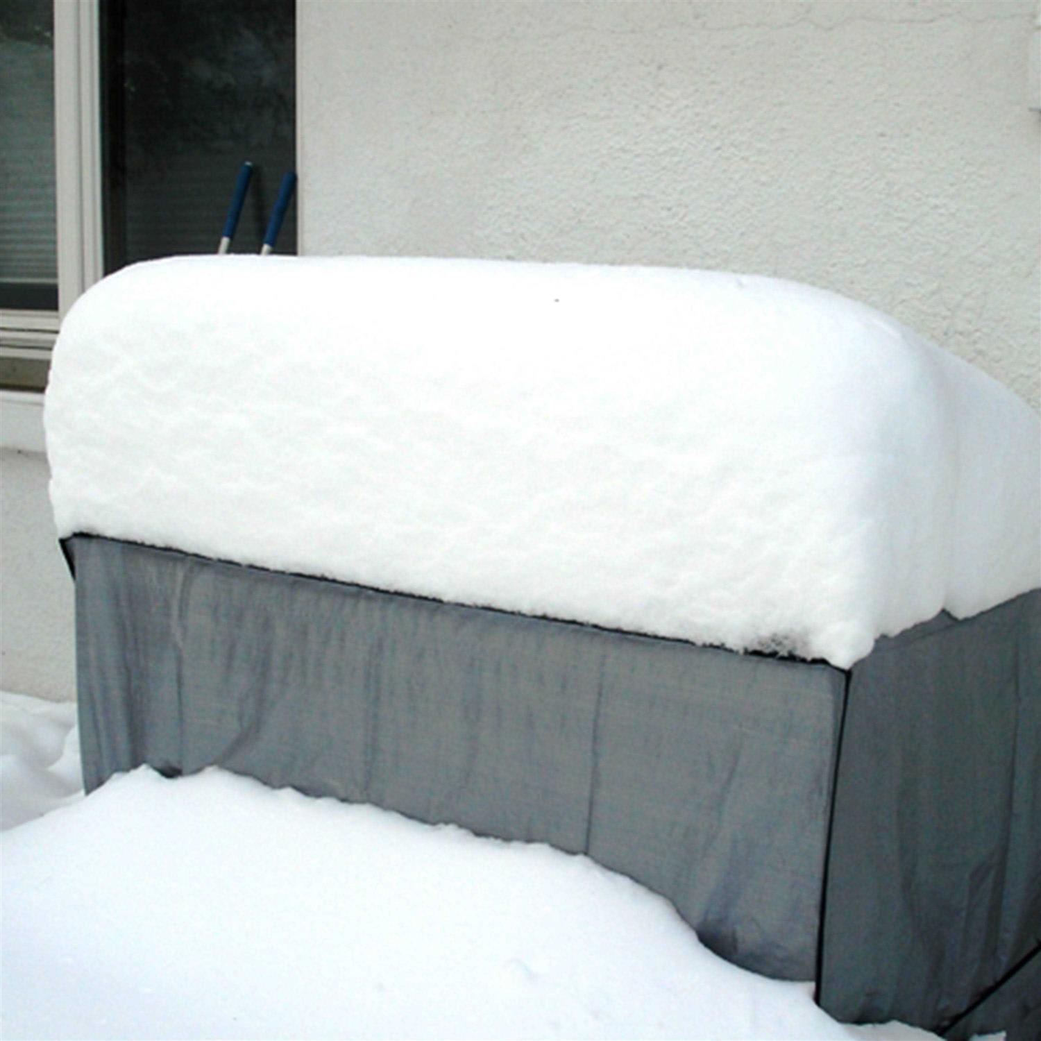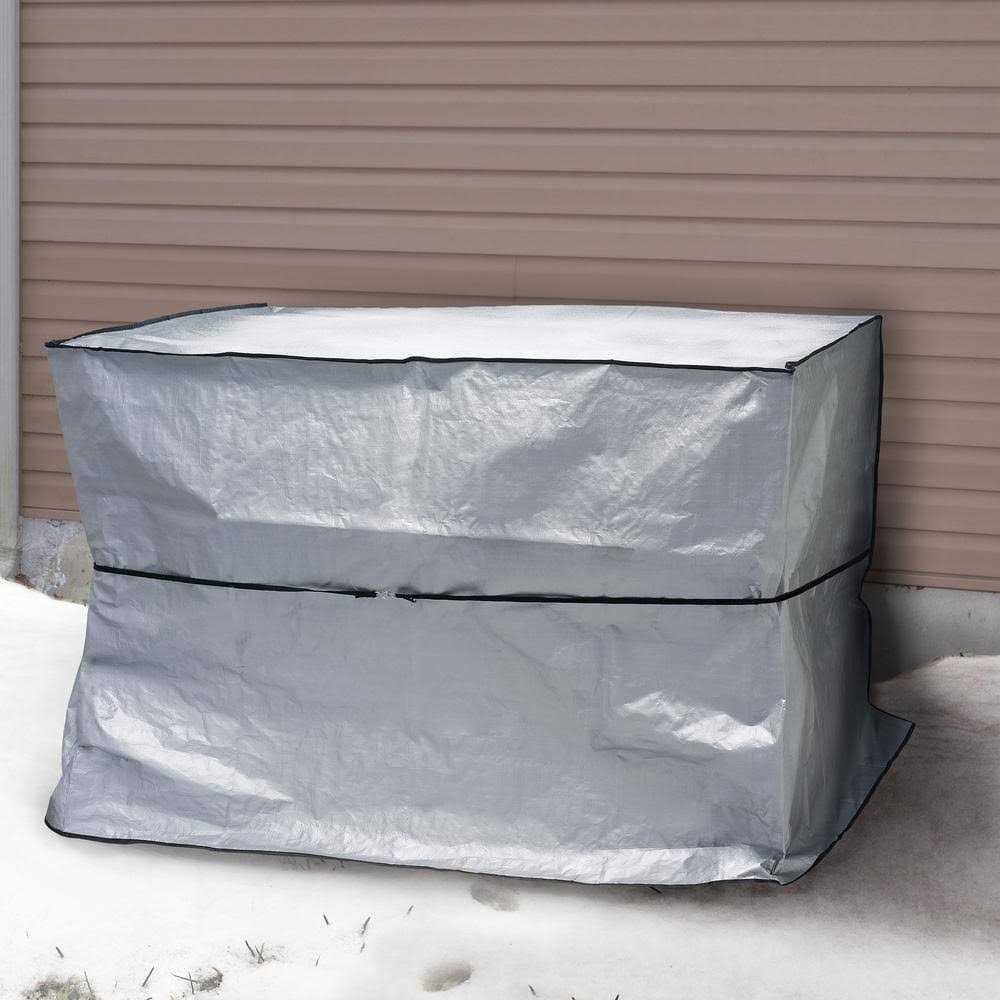 Air conditioner covers polyethylene rectangular central unit – 48 inches long by 36 inches wide by 34 inches height Tall made of reinforced vinyl tarp material with tie-down straps. Protects unit from weather damage. Elastic strap provides a sure fit. Will not crack or mildew.