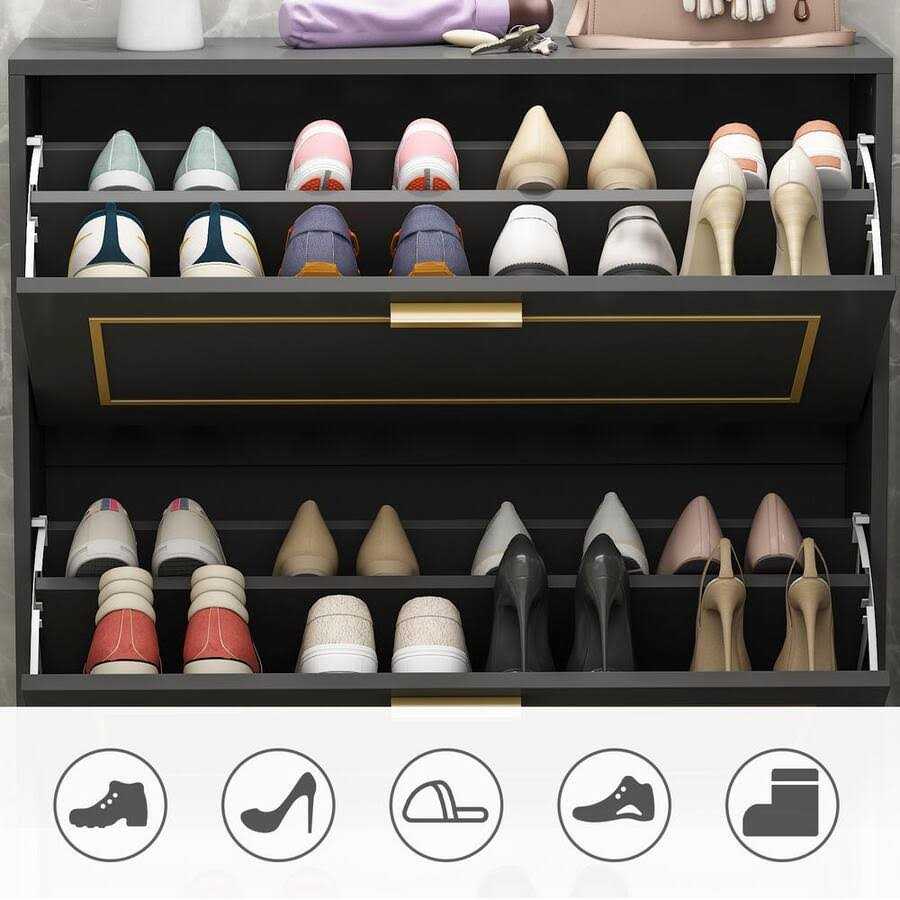 Still worried about the mess of your entryway with too many shoes lying on the mat. This is exactly what you need. With good looking color and simple, luxurious design, this shoe storage cabinet provides a sense of modernization, which also enriches your entire entryway. Features spacious pull down folding drawers, the inside divider comes with 2-inside components, which exactly meets your space needs for shoe storage. Color: Black.