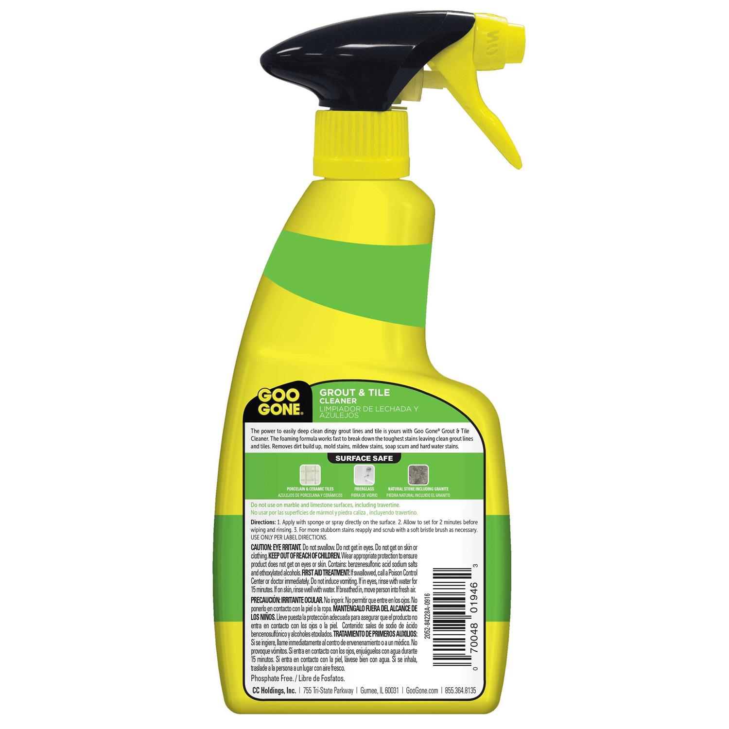 Freshen your foyer, buff your backsplash, and scour your shower with Goo Gone Grout & Tile Cleaner. This product can damage travertine, marble and limestone. For light to moderate grout stains, allow the cleaner to sit for a couple minutes and very little scrubbing will be required. For deeper, darker or older stains allow the cleaner to soak longer and expect to do a good bit of scrubbi Works on dirt buildup, mold stains, mildew stains, soap scum, hard water stains Do not use on marble and limestone surfaces, including travertine. Apply with sponge or spray directly on the surface. Allow to set for 2 minutes before wiping and rinsing. For more stubborn stains, reapply and scrub with a soft bristle brush as necessary. Use only per label directions.