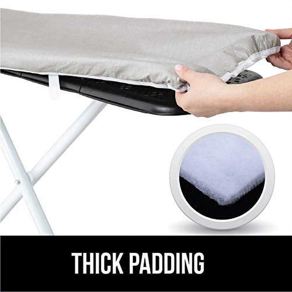 GORILLA GRIP DURABILITY: Get ready to meet the toughest cover on the block. Other covers move around or scorch easily. Not the Gorilla Grip ultra heavy duty, thickly padded and premium laundry board cover. Our pad will last a lifetime! IRON FASTER WITH REFLECTIVE HEAT: Our ground breaking silicone surface reflects the heat of your iron so you achieve perfect, wrinkle-free clothes in a fraction of the time. Its like having the iron heat on both sides of your clothing at the same time.STAYS PUT: Focus on your clothes and not your cover moving. The entire edge of our board features a strong bungee like elastic that will keep your board in place. Plus, there are two underside Velcro straps for even more secure protection.GENEROUSLY SIZED AND EASILY TAILORED TO FIT A WIDE RANGE OF BOARDS: The 15 inch x 54 inch cover fits all standard sized ironing boards. The elasticized edges help create the look of a custom cover for a perfect fi
