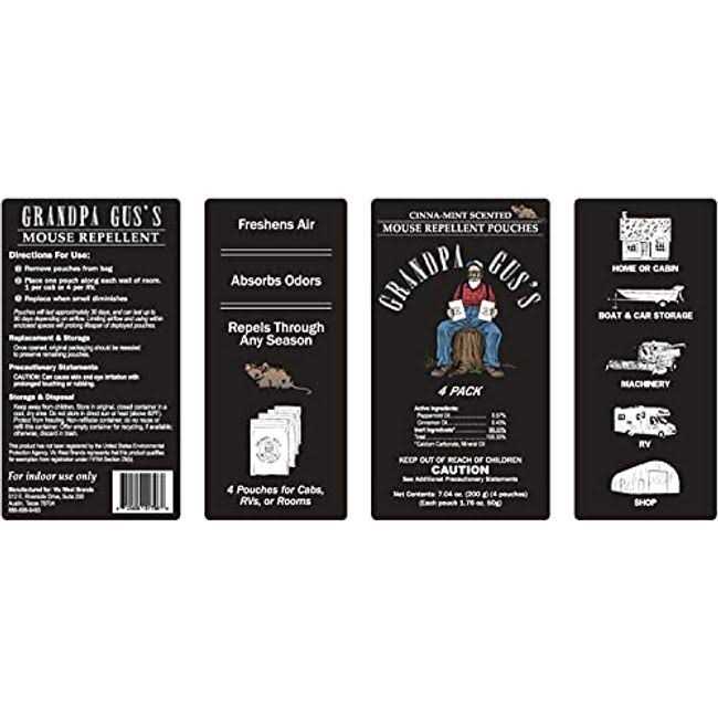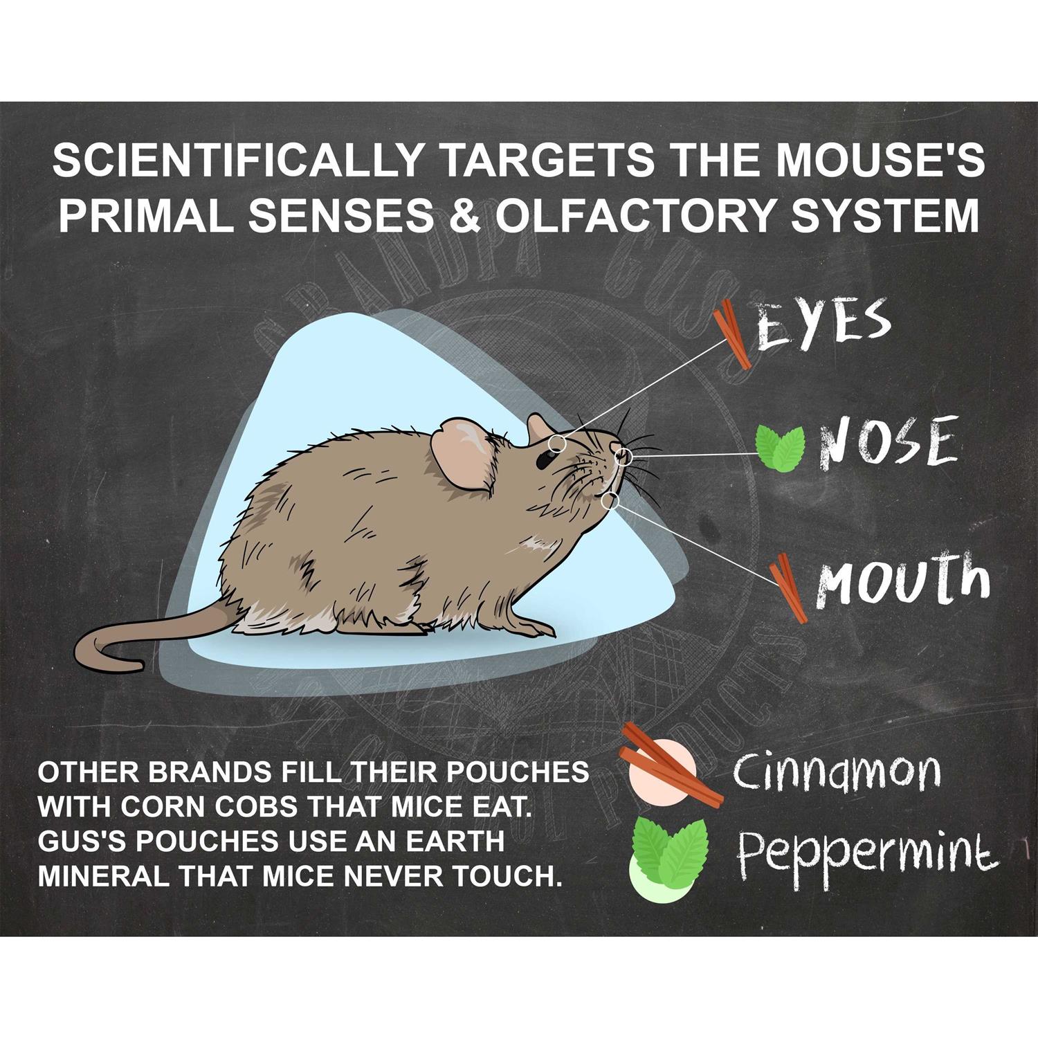 Product Description Protect your family and belongings from mice with Grandpa Gus’s Mouse Pouches. Simply place a pouch where you’ve seen mice and the fresh peppermint and cinnamon scent will keep them away all season long. Doubles as an air freshener and odor absorber. A hassle-free pest control barrier that works in any home Safe and effective, all natural formula made from essential oils that repel mice. Safe to use at home, a better solution at home than toxic poisons or snap traps No mess, no clean-up, easy to use pouches come in resealable coffee bag. Pull out one pouch, hang, and smell it working as you walk away. No traps to check, no dead rodents. Keeps house mice, field mice, deer mice, country mice out of your vehicle or Double as an air freshener- Leaves vehicles, closets and cabinets smelling minty fresh. Simply open the resealable bag, hang, and go. No stinky repellent chemicals in your home, just essential oil freshness Absorbs leftover smell.