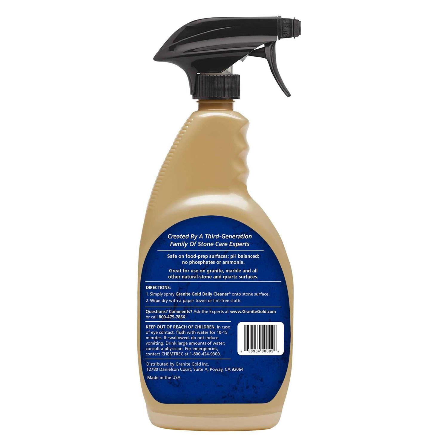 The stone care experts who developed Granite Gold have created a stone surface cleaning product that is unrivaled in versatility safety and ease of use. Unlike most other natural stone cleaning products that leave behind residue contain toxic chemicals or have an unpleasant smell Granite Gold leaves behind no streaks and features a mild citrus scent. Granite Gold Daily Cleaner comes in a 32-ounce convenient spray bottle. Using this cleaner regularly will keep your stone surfaces protected and looking as gorgeous as the day they were installed. What good is a cleaning product if it leaves behind ugly streaks smudges and residue that you have to clean up again? The Granite Gold Daily Cleaner creates an absolutely flawless streak-free result. A helpful cleaning tip is to use a circular motion when wiping off the solution. The counter cleaner is non-toxic non-acidic and contains no phosphates or ammonia. This daily cleaner is biodegradable pH balanced and safe to use on food prep surfaces. Use it on many natural stone surfaces other than granite. It is a fantastic daily cleaner for marble limestone travertine onyx and slate. Granite Gold can be used on any finish and it also works great on engineered surfaces like ceramic tile porcelain tile concrete Formica and quartz surfaces such as Corian Silestone Terrazzo Caesarstone Cambria and more. About Granite Gold Known widely as the Stone Care Experts Granite Golds passion is natural stone. Granite Gold is a family owned company with more than 50 years of experience in stone care that spans over three generations. The Granite Gold collection of products is unsurpassed in expertise passion and quality protecting your natural stone like no other product.