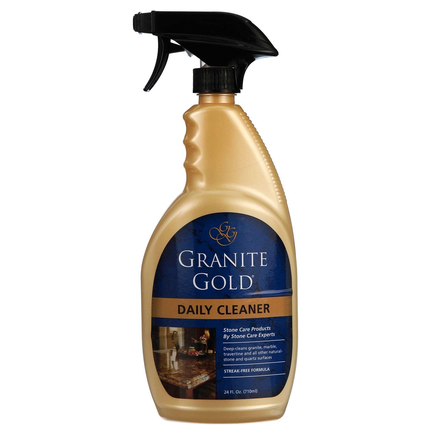 Developed by stone care experts with more than 50 years? experience manufacturing, installing and restoring stone surfaces, the quality and versatility of Granite Gold cleaning products is truly unrivaled. Each order includes (1) 24-ounce spray bottle and (1) 64-ounce refill container. This value pack will save you money and ensure that you will always have ample supply of your favorite granite cleaner. Using this cleaner regularly will keep your stone surfaces protected and looking as gorgeous as the day you got them. What good is a cleaning product if it leaves behind ugly streaks, smudges and residue? Granite Gold Daily Cleaner creates an absolutely flawless, streak-free result. Just spray it on and wipe clean with a paper towel or lint-free cloth. A helpful trick is to use a circular motion when wiping off the solution. You will love the pleasant fresh citrus scent this cleaner leaves behind. The counter cleaner is non-toxic, non-acidic and contains no phosphates or ammonia. This daily cleaner is biodegradable, pH balanced and safe to use on food prep surfaces.Use it on many surfaces other than granite. It is a fantastic daily cleaner for marble, limestone, travertine, onyx and slate. Granite Gold can be used on any finish and it also works great on ceramic tile, porcelain tile, concrete, Formica and quartz surfaces such as Corian, Silestone, Terrazzo, Caesarstone, Cambria and more. These products are proudly made in the USA.About Granite GoldKnown widely as the Stone Care Experts, Granite Golds passion is natural stone. Granite Gold is a family owned company with more than 50 years of experience in stone care that spans over three generations. The Granite Gold collection of products is unsurpassed in expertise, passion and quality, protecting your natural stone like no other product.