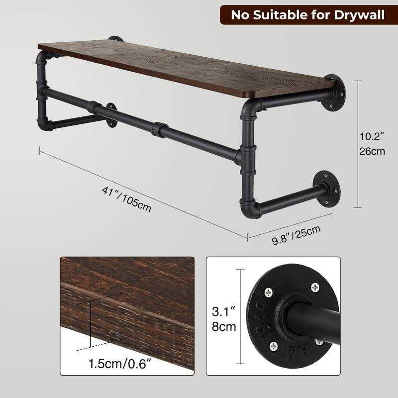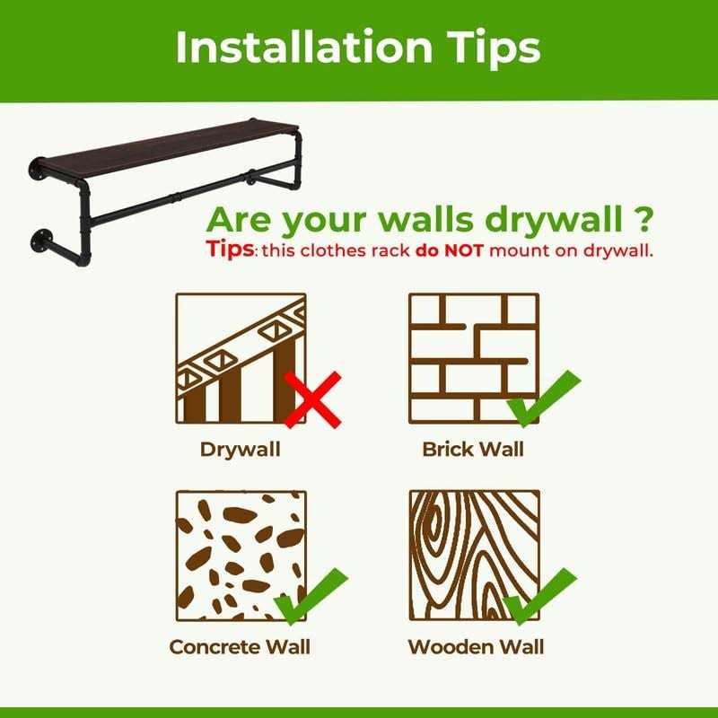 Industrial and Retro Design: This clothes rack is made of high quality iron pipes, smooth matte black-finished surface, Industrial Chic Modern Rustic Steampunk Farmhouse and Urban Looking Furniture. Its unique and vintage look is great in your room and could be also used in a hallway, entryway, bedroom, closet, laundry room or balcony. Sturdy and Durable: This garment rack is very sturdy installed on solid wall. This item includes hardware to mount on concrete,tile walls or other types walls. It can hold over 132lbs (Note: It is NOT recommended to install on Drywall.) Easy to Install & Reusable: All parts are detachable, be sure to screw them tight then mount it to the wall. This easy to use rack goes up in minutes. Multiple Functions: Not only does this rack work great for clothes, hats and scarves, but you can also hang towels or plants to decorate your room. This stylish rack will integrate perfectly with your home decor. Space Saving & Qu