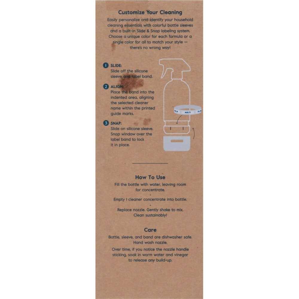 A Reusable Cleaning Glass Spray Bottle – Slide & Snap with a unique silicone sleeve that allows you to label what’s inside your bottle for customizing your cleaning routine. Plastic-free and crafted to be sustainably powerful for a healthy home and planet.