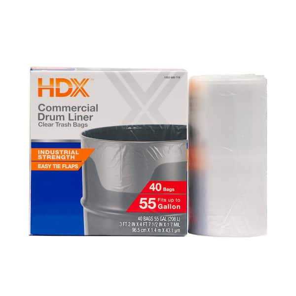 Move your trash and recycling with confidence using the HDX 55 Gal. Manufactured using premium polyethylene resin for strength and durability, these clear bags are 1.7 mil in thickness and boast flap tie closures to keep contents easily contained. 1-by-1 dispensing design provides easy access.
