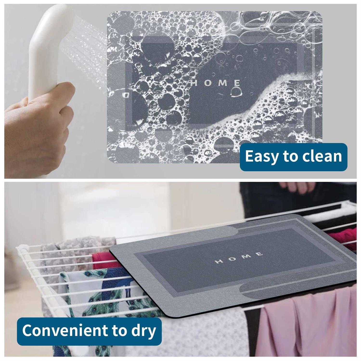 【SUPER ABSORBENT BATH MAT】: These bath mats for bathroom are thin and comfortable which are made of technical diatomite materials. They can absorb as much water as possible from your wet feet after shower. This super absorbent bath mat will make water be absorbed extreme quickly that you will see water droplets disappear very quickly on the surface within 1~2 seconds (Compared to other most will be more than 3~5 seconds). 【NON-SLIP SUPER ABSORBENT BATH MAT】: This super absorbent bath mat has updated version slip-resistant rubber mesh on the back which can prevent the slipping. You will not be worried about the slipping after your shower or washing absolutely. Even on very slippery floor, the non-slip super absorbent bath mat remains in place. 【MULTIPLE-PURPOSE USAGE】: This super absorbent bath mat is only 0.16 inch thick. It is suitable in different seasons and places, such as bathroom, sink bathtub, under kitchen sinks, laundry room, entrance of house or garage, living room, bedroom etc. It could be used on the tile and wooden floor with radiant heat which is below 122°F(50°C). You won’t feel cold in winter and won’t feel hot in summer when step on it. It also could be a great choice of a small gift for friends. 【EASY TO CLEAN】: Unlike traditional bathmats, these bath mats for bathroom won’t contain hair, dust and dirt. If there is muddy or dust on it, only needs to be cleaned with a little detergent and clean water, and with a brush or sponge, which saves your time and energy. This super absorbent bath mat also can be machine-washable, but hand wash would be a better choice. 【MULTIPLE SIZE CHOICES】: The super absorbent bath mat has four size to choose: 1. Small:23.6”x15.7”;2. Medium:27.5”x17.0”;3. Big:31.5”x19.7”;4. Long: 59”x17.7”. Small or Medium is perfect for small spaces of bathroom, such as under single sink or out of single shower room. Big Size is for bigger bathroom, such as under double sinks or bathtub. Long Size is suit for kitchen or big shower room&bathtub.