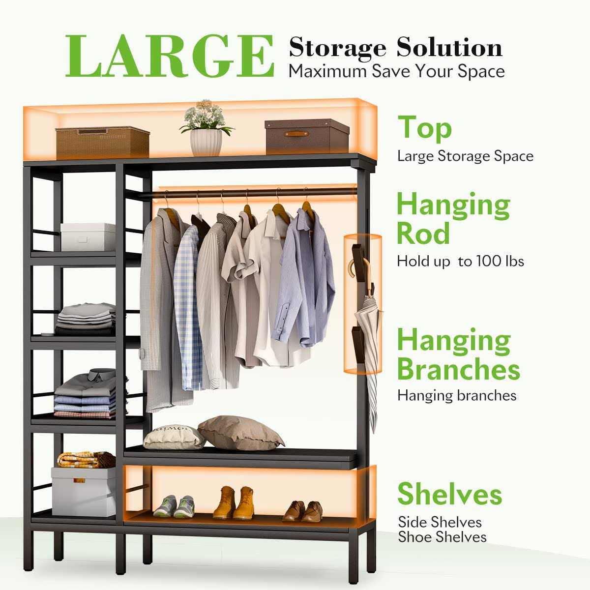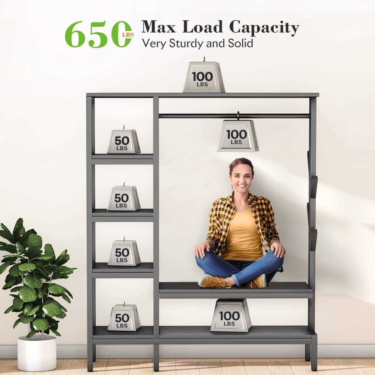 The closet organizer shelves with garment rack is a good floor room closet ideal for space saving and getting your room tidy. With the metal structure and outstanding look, it can be used in living rooms, bedrooms, walk-in closets, laundry rooms, entry from garages, cloakrooms, and more. Due to the 20mm wide metal poles, it is very sturdy, solid, stable, can hold up to 650lbs without bending or wobbling.