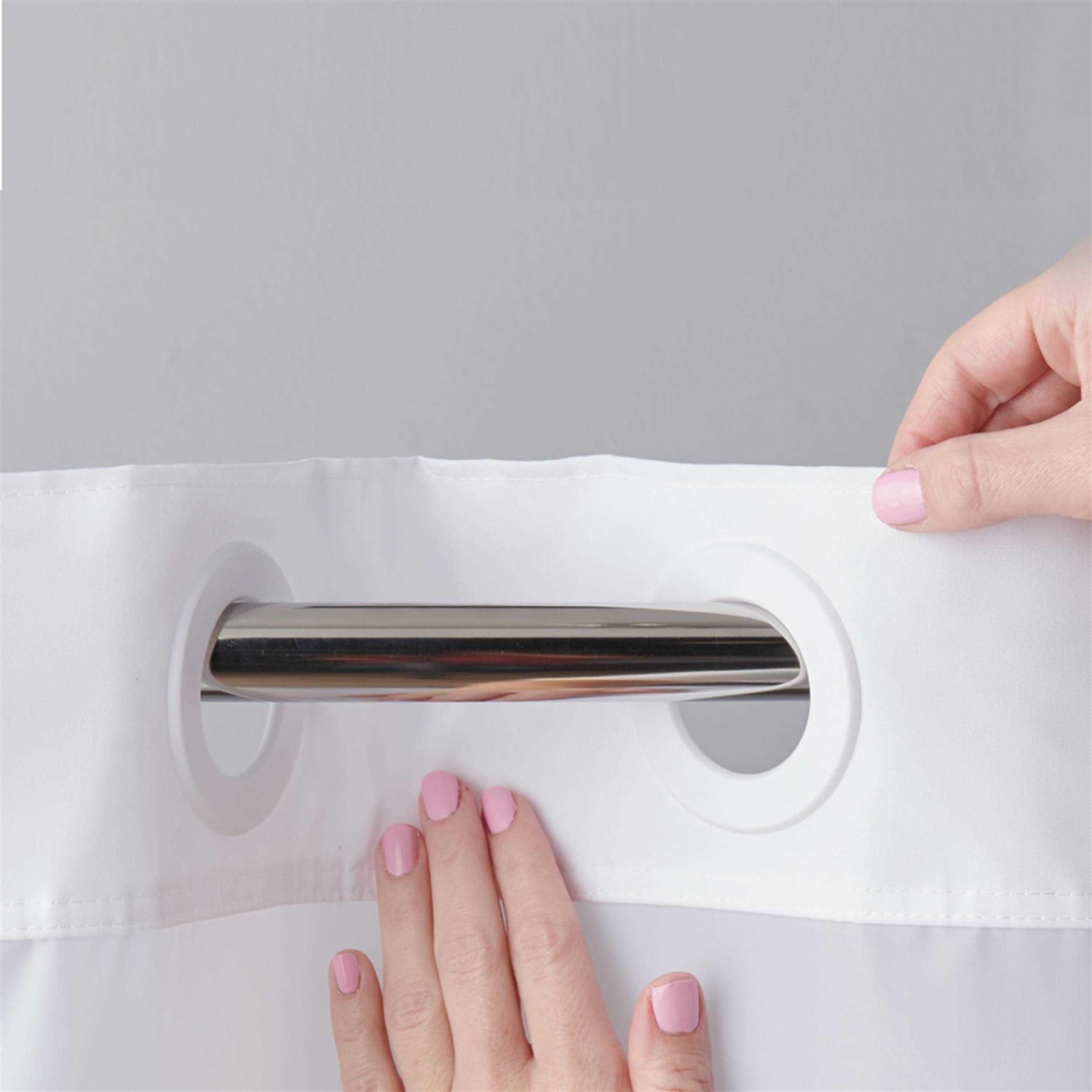 Bring that spa-like experience to your bathroom with the original Hookless Shower Curtain Set. The patented Hookless Shower Curtain Set offers a 3-in-1 value and adds an unexpected way to refresh your bathroom décor effortlessly in seconds. With no hooks to buy, you will save money while saving time with the convenience of a shower curtain that slides right onto your hanging shower curtain rod, installing in seconds with no need to remove the rod. The patented plastic FLEX-ON rings will never rust, and the It’s A Snap! liner literally snaps on and off, so you can change it in seconds. The attached PEVA liner is eco-friendly, and repels water making for easy care and maintenance. A sheer window lets Light in, maintains privacy, and reduces humidity and moisture.