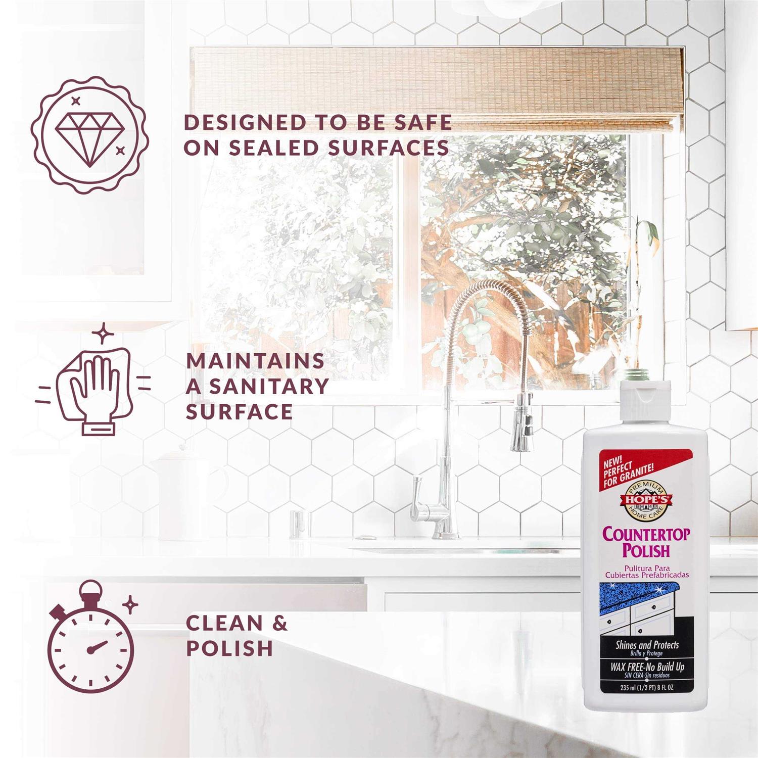 Makes countertops shine like new Safe for use on all brands of countertops. No harsh chemicals Wipe on wipe off easy to use Hope’s Countertop Polish : Is a unique wax-free formulation that cleans, beautifies, minimizes fingerprints. Major countertop manufacturers including DuPont Corian recommend it. Non-toxic, safe and pleasantly scented.