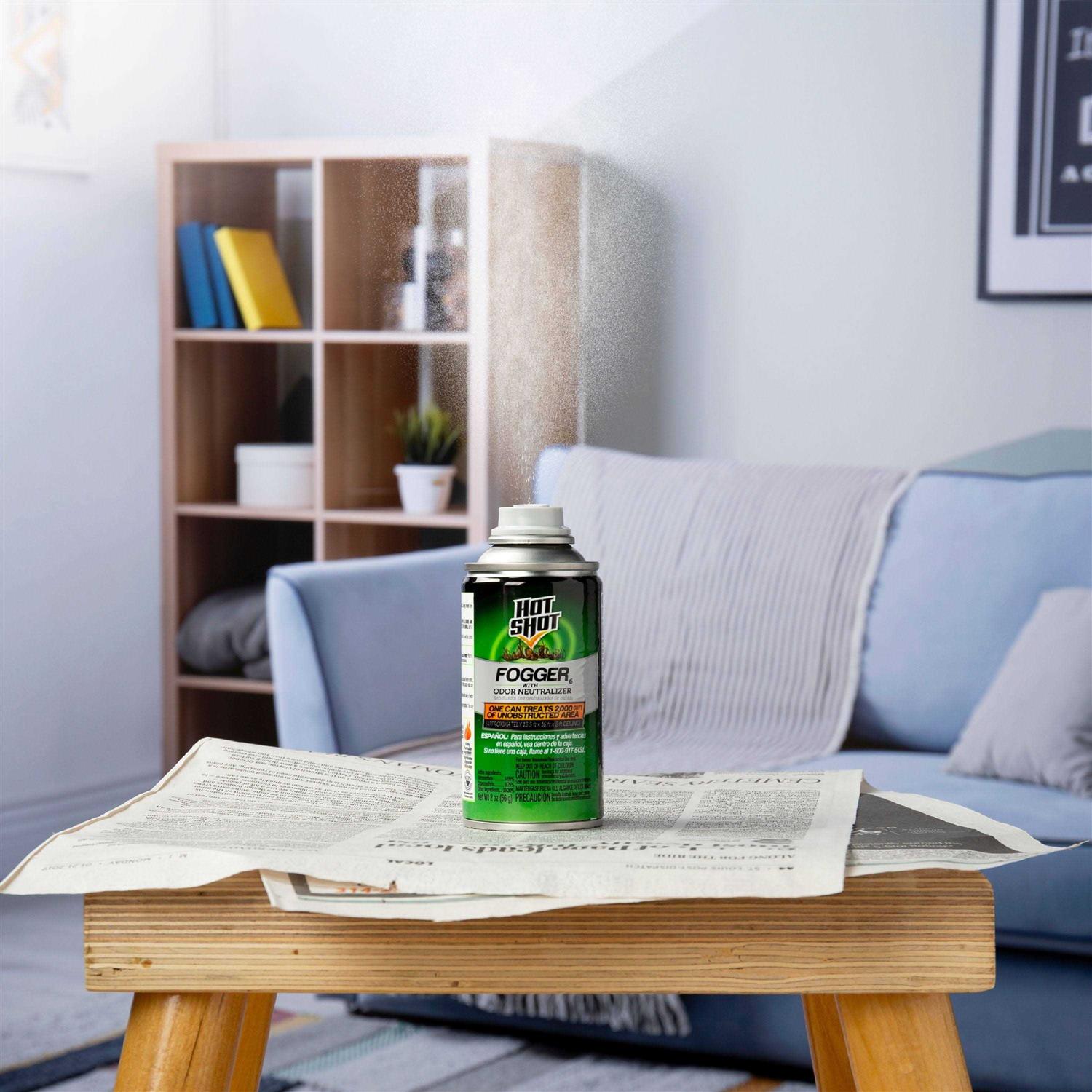 Hot Shot Fogger With Odor Neutralizer creates a ne, penetrating mist that reaches deep into cracks and crevices to ush out and kill hidden bugs on contact. This product kills ants (except fire ants), black carpet beetles, brown dog ticks, crickets, earwigs, firebrats, fleas, flies, gnats, houseflies, mosquitoes, palmetto bugs, pillbugs, rice weevils, roaches, saw toothed grain beetles, silverfish, small flying moths, spiders and waterbugs. Does not control bed bugs. When used as directed, the clear, non-staining formula will not harm drapes, upholstery, fabrics, carpeting, bedspreads, oor tiles, wood oors, linens, furniture, walls, clothing, ceilings, shades or blinds. Hot Shot Fogger With Odor Neutralizer kills both ying and crawling insects on contact and keeps killing for up to 2 months without leaving a wet residue. One can of this product treats up to 2,000 cubic feet of unobstructed space. Read and follow all label directions before using this product.