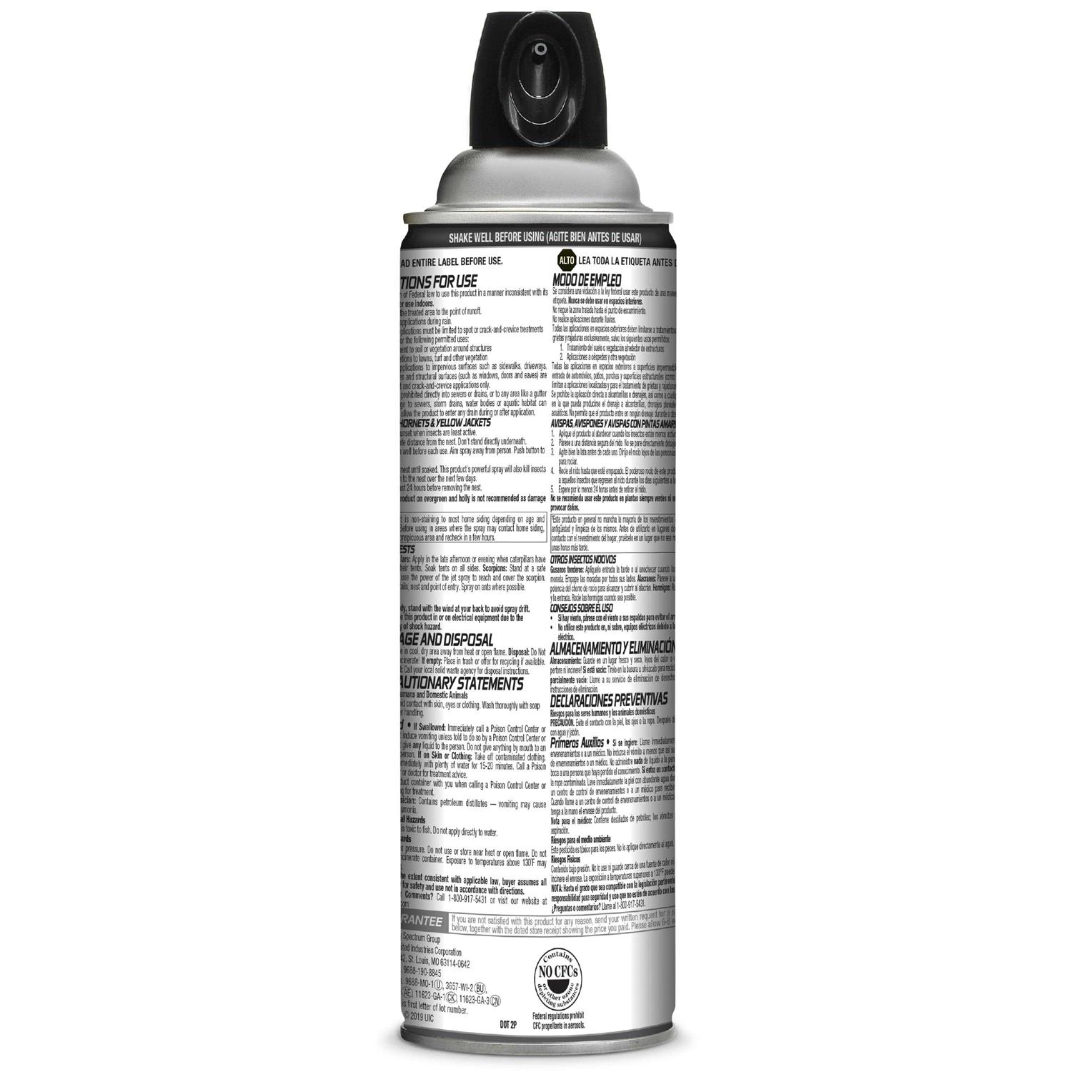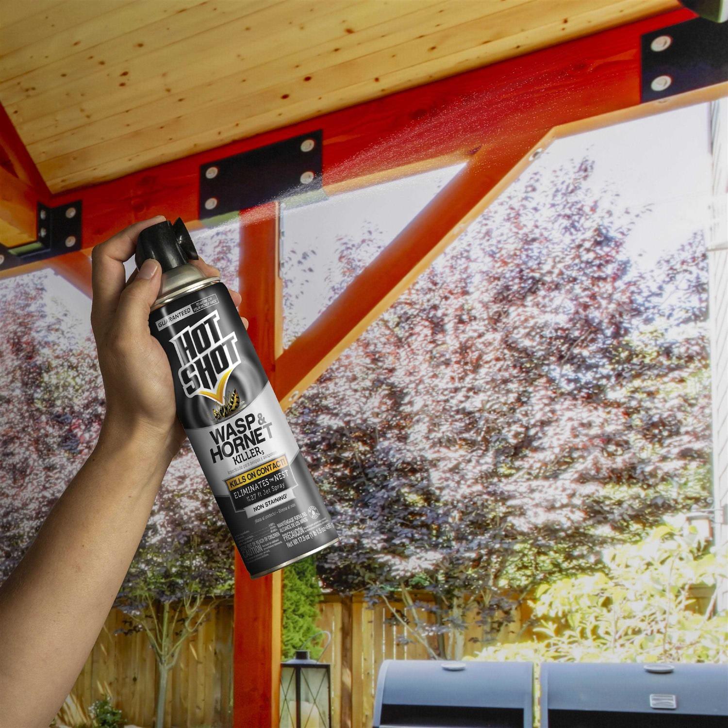 Hot Shot Wasp & Hornet Bonus size is 17.5 ounces. The powerful spray kills on contact and kills insects that return to the nest. Kills wasps, hornets, yellow jackets, scorpions and tent caterpillars. Water-based formula is non-staining and leaves no oily residue. The jet spray reaches up to 27 feet.
