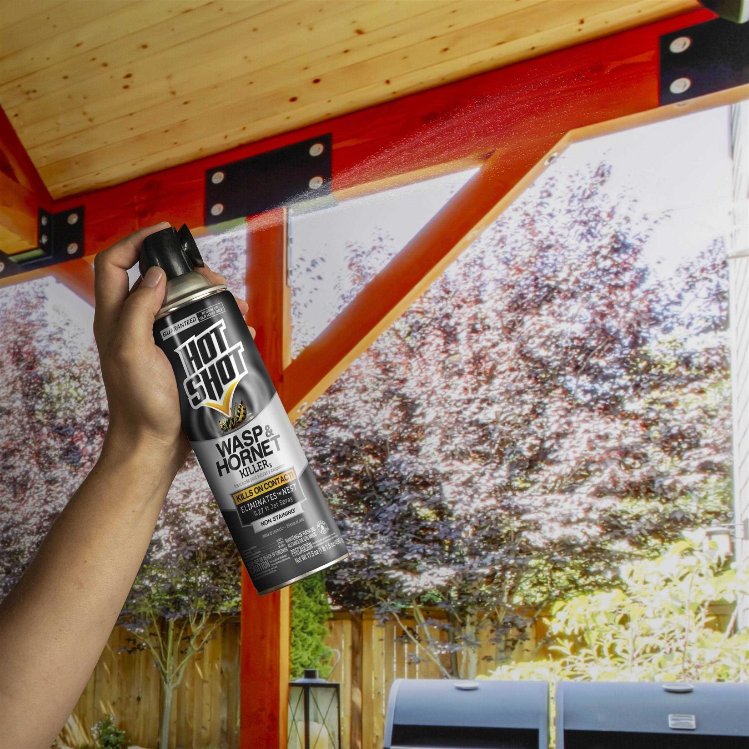 Hot Shot Wasp & Hornet Killer aerosol kills on contact and eliminates the nest. With a jet spray of up to 27 feet, this product also kills yellow jackets, tent caterpillars and scorpions for outdoor use only. Hot Shot Wasp & Hornet Killer is non-staining to most home siding depending on age and cleanliness (before using in areas where the spray may contact home siding, test in an inconspicuous area and recheck in a few hours). For wasps, hornets and yellow jackets, apply at sunset when insects are least active. Stand a safe distance from the nest dont stand directly underneath. Spray the nest until soaked this products powerful spray will also kill insects that return to the nest over the next few days. Read label for complete instructions before use.