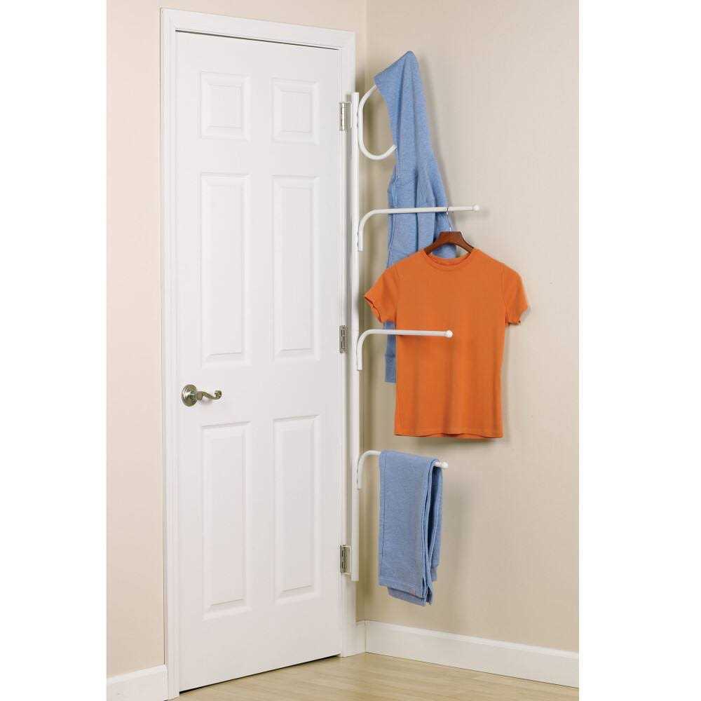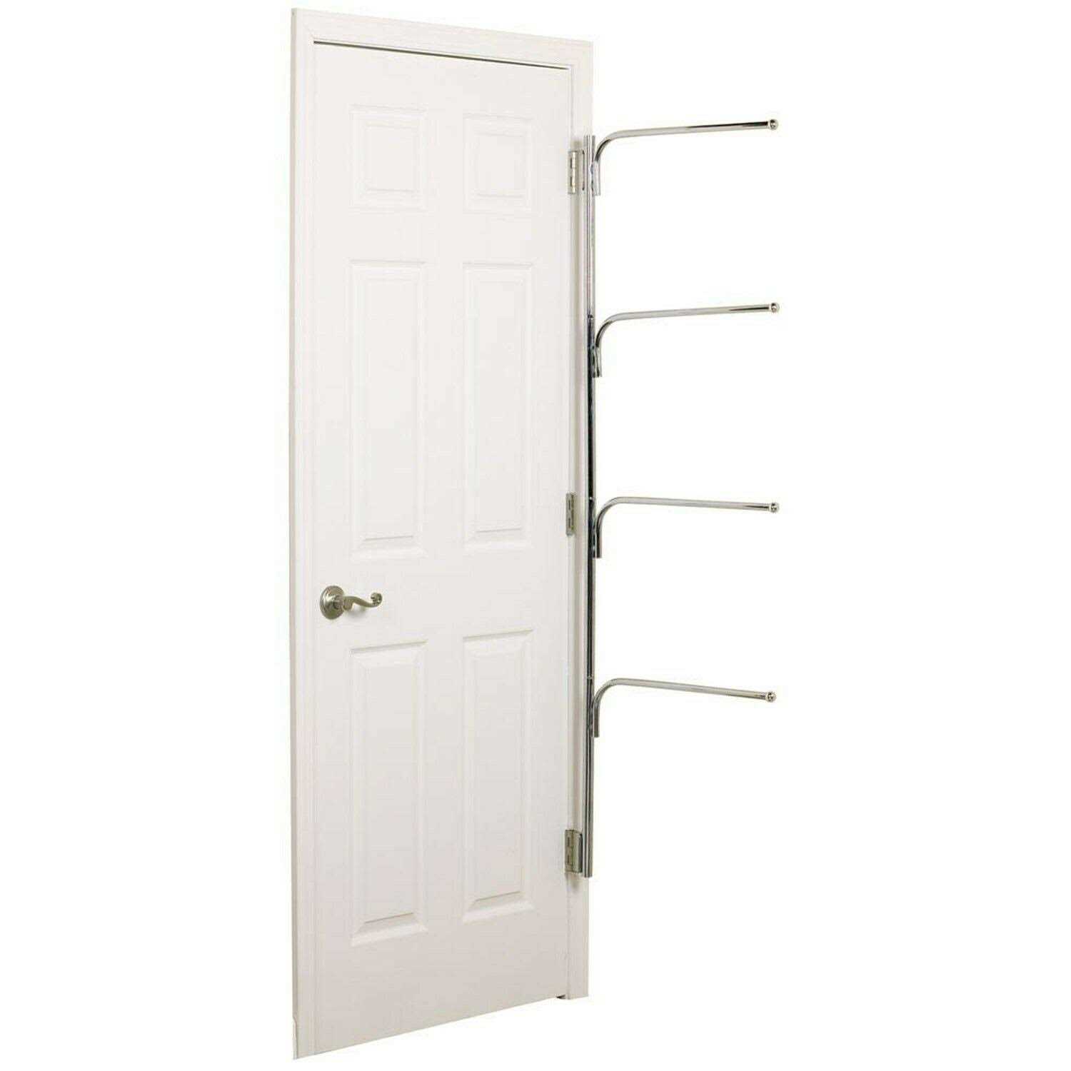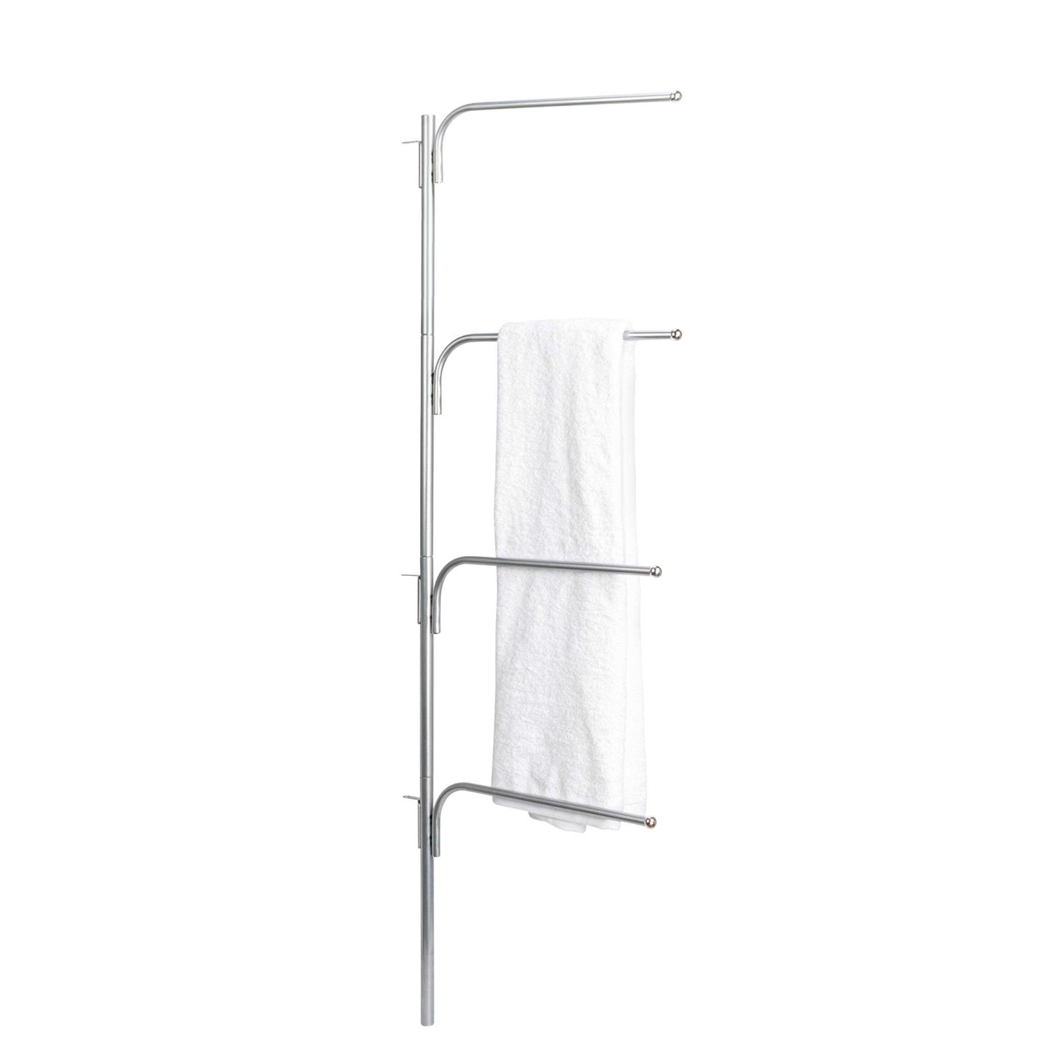 Instantly providing four places to hang towels, robes, clothes or accessories, this towel bar fits discreetly behind any door. holds 3 times more than most standard towel bars behind-the-door design mounts on a single hinge fits most standard doors 4 bars; each swivels independently for easy access protective cap protects hanging garments and helps keep them on the bar Steel. Measures 20x1x70″H. Assembly required. Imported.